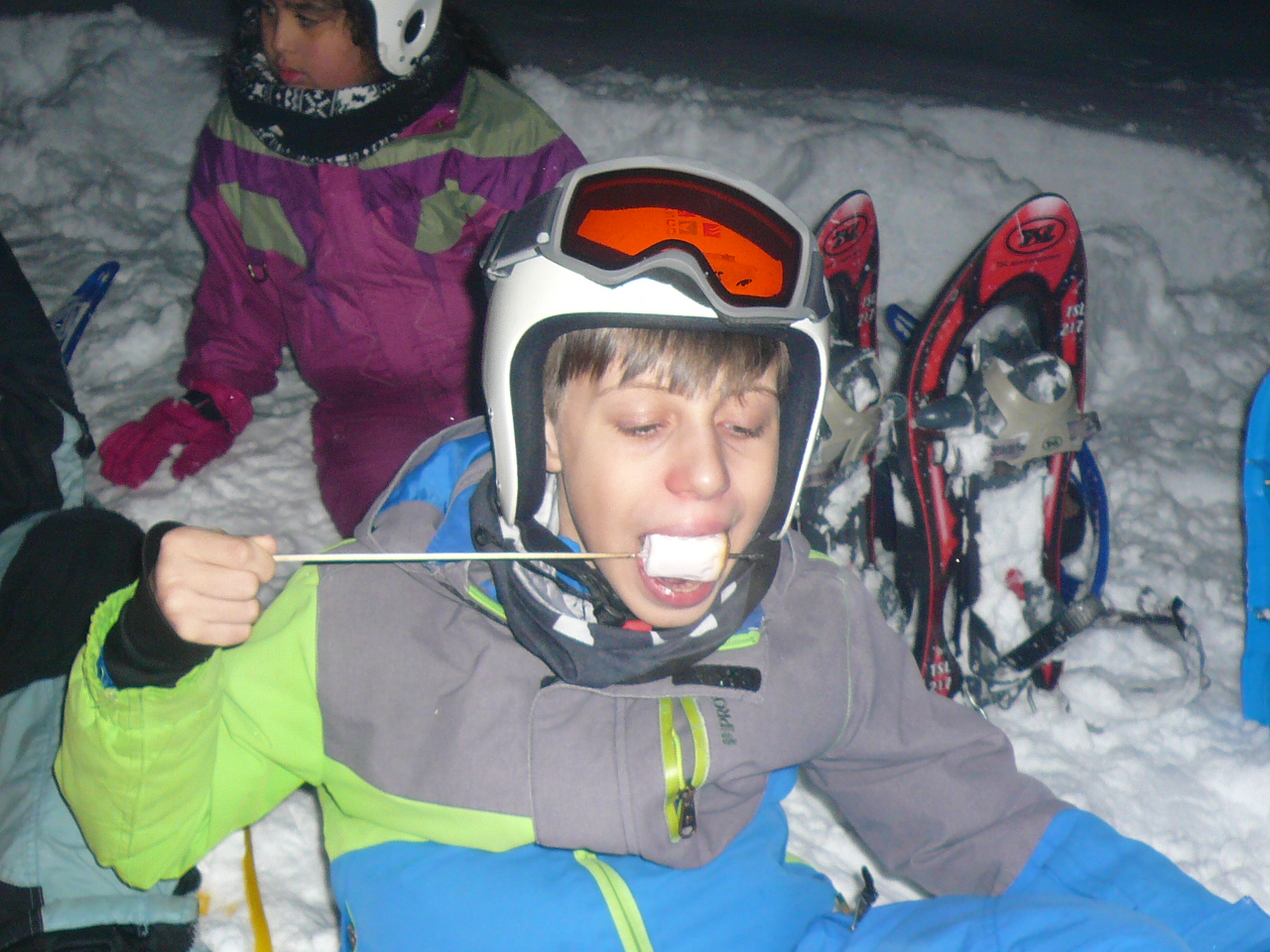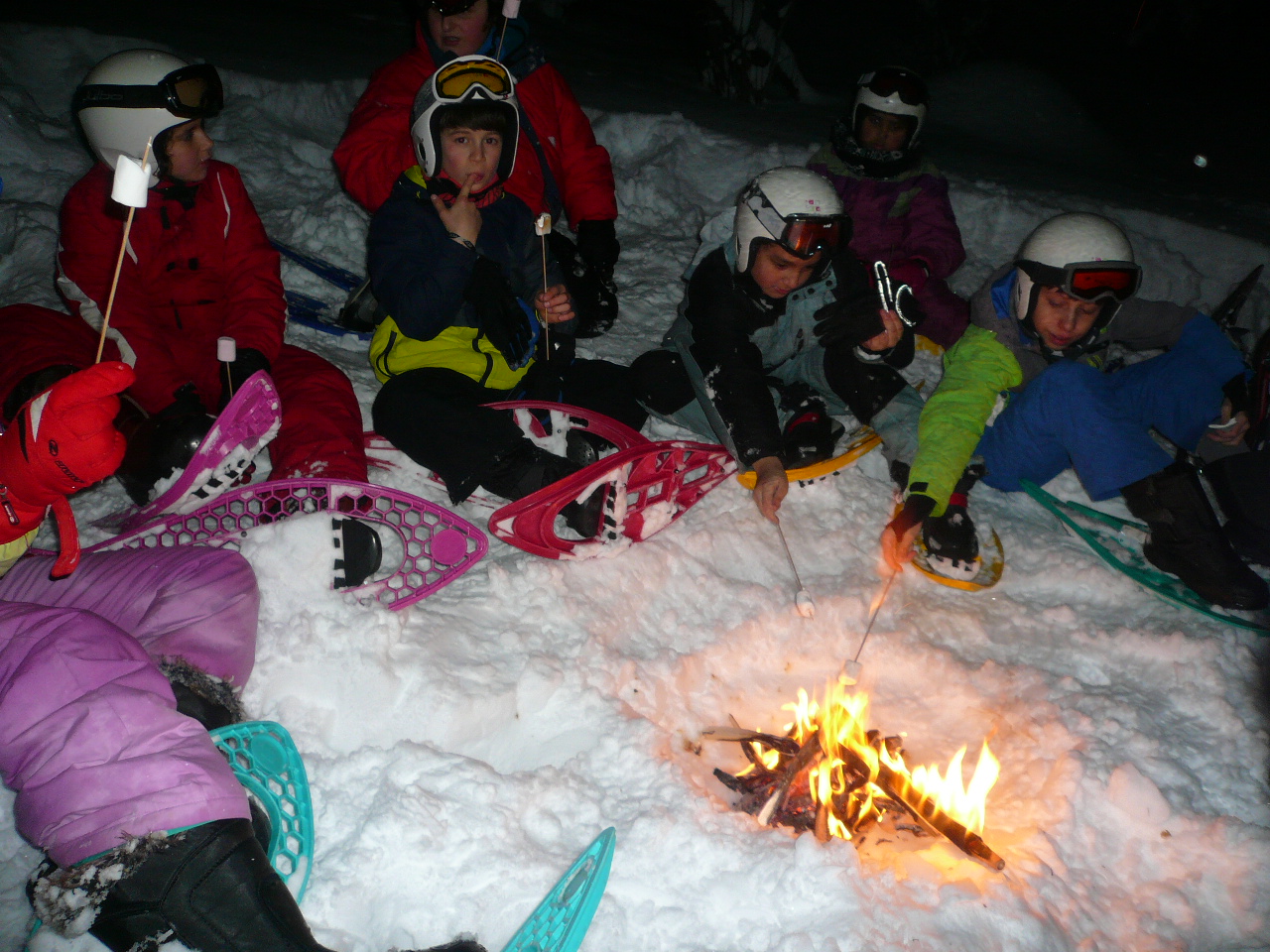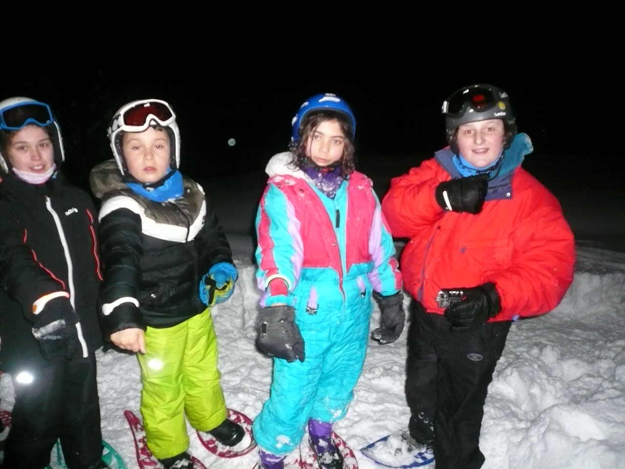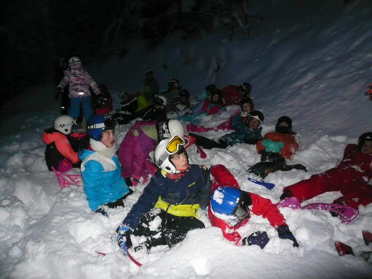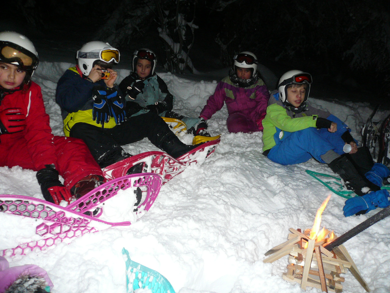Et enfin la veillée la plus attendue de tous: la balade nocturne en raquettes ! Merci à notre guide Pierre, c'était génial, au-delà de nos espérances ! Imaginez l'ambiance: chausser les raquettes à la tombée de la nuit, faire la trace dans 50 cm de poudreuse fraîchement tombée, tous à la queue leu leu éclairés par les lueurs du ciel, atteindre une petite clairière, faire coucou à la lune et à Vénus (étoile du berger), damer une petite terrasse sous un mélèze, allumer un feu, boire une petite boisson à la fraise ou à l'orange, faire griller des chamallows, réciter la poésie de Samivel "Les merveilles de la montagne ne coûtent pas un centime" et surtout ressentir tout ce que nous dit ce grand poète "écouter les musiques de la montagne"... puis redescendre vers le centre en enchaînant les glissades... Quel bonheur de partager ce moment tous ensemble !