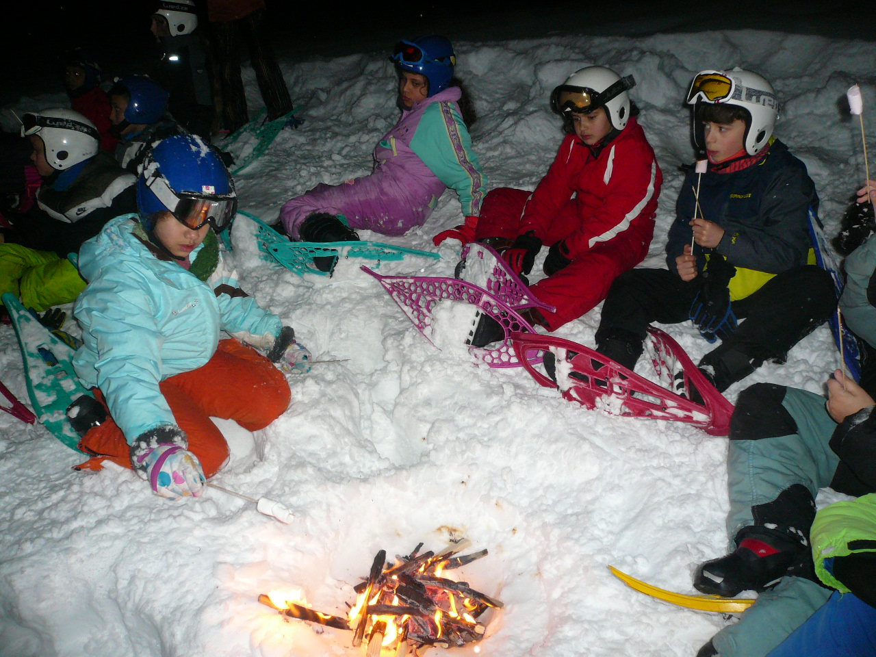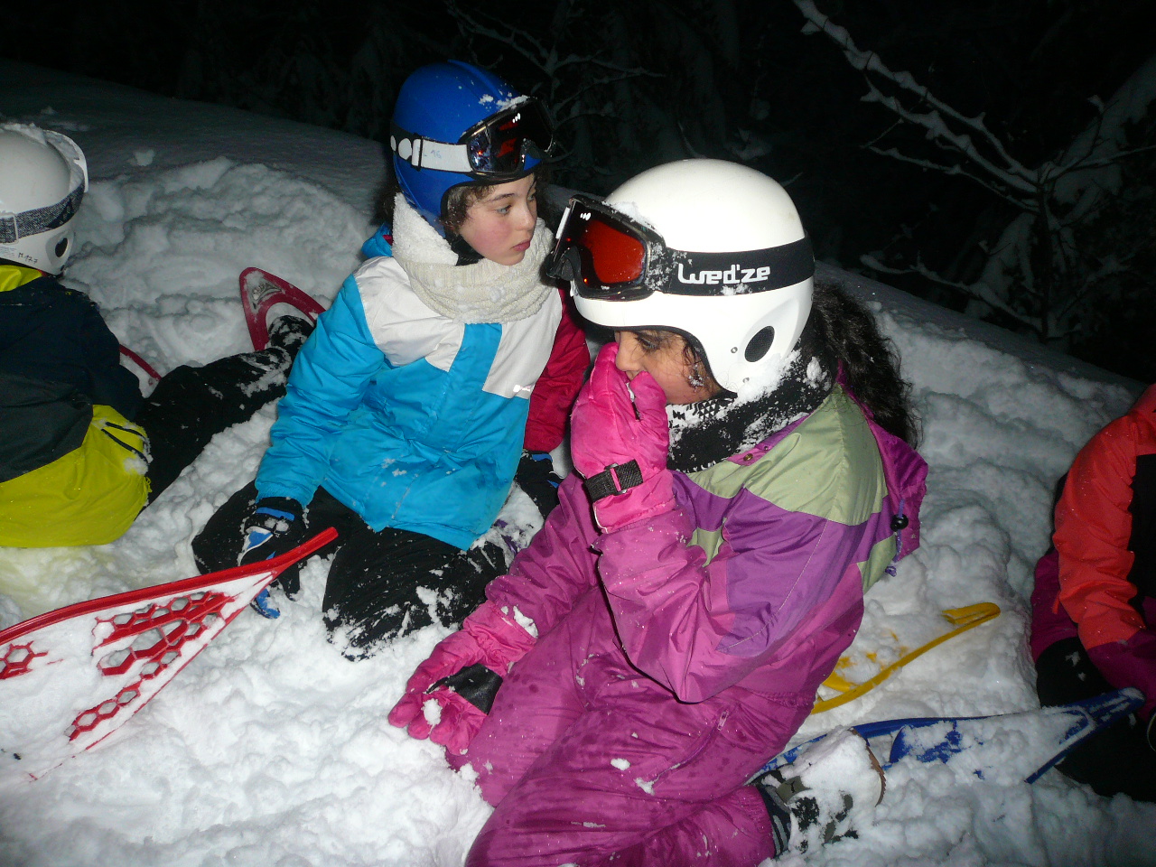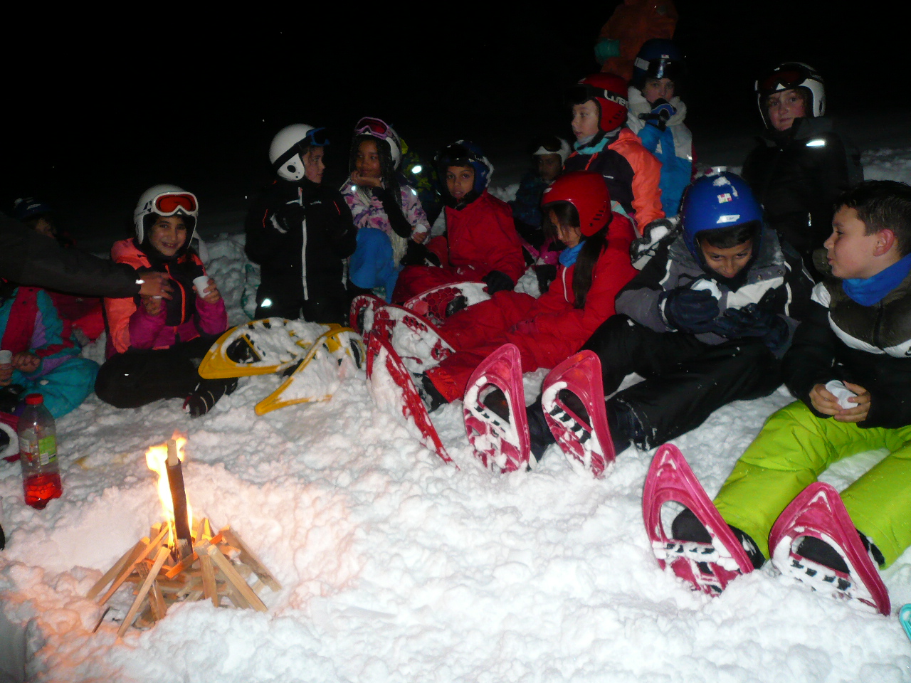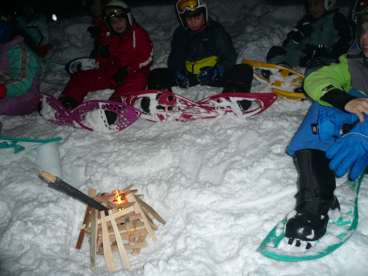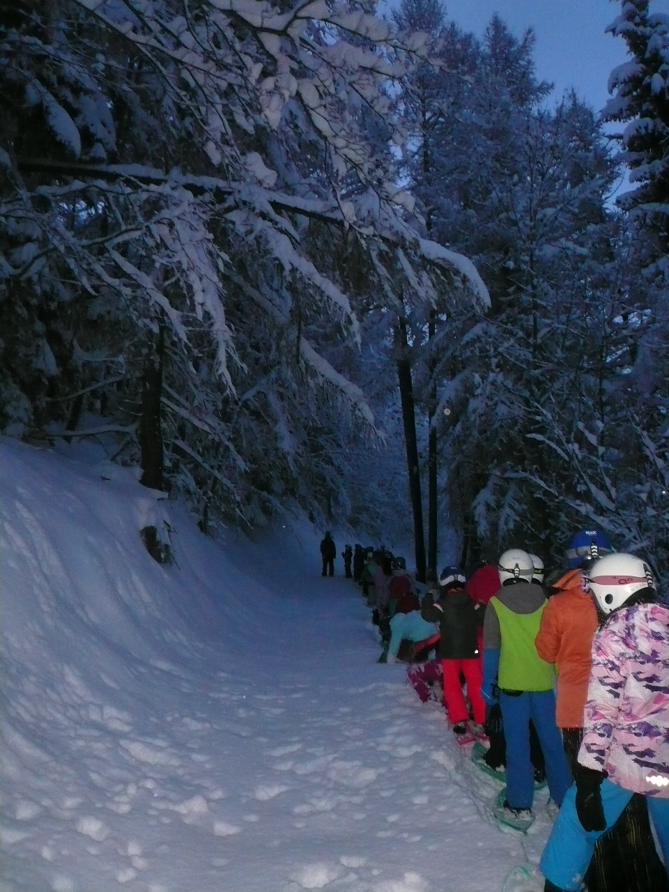 Et enfin la veillée la plus attendue de tous: la balade nocturne en raquettes ! Merci à notre guide Pierre, c'était génial, au-delà de nos espérances ! Imaginez l'ambiance: chausser les raquettes à la tombée de la nuit, faire la trace dans 50 cm de poudreuse fraîchement tombée, tous à la queue leu leu éclairés par les lueurs du ciel, atteindre une petite clairière, faire coucou à la lune et à Vénus (étoile du berger), damer une petite terrasse sous un mélèze, allumer un feu, boire une petite boisson à la fraise ou à l'orange, faire griller des chamallows, réciter la poésie de Samivel "Les merveilles de la montagne ne coûtent pas un centime" et surtout ressentir tout ce que nous dit ce grand poète "écouter les musiques de la montagne"... puis redescendre vers le centre en enchaînant les glissades... Quel bonheur de partager ce moment tous ensemble !