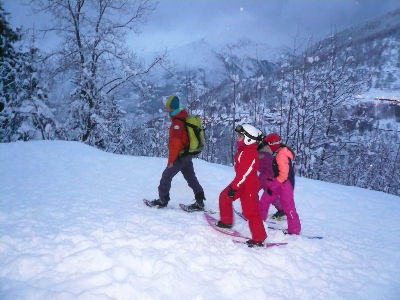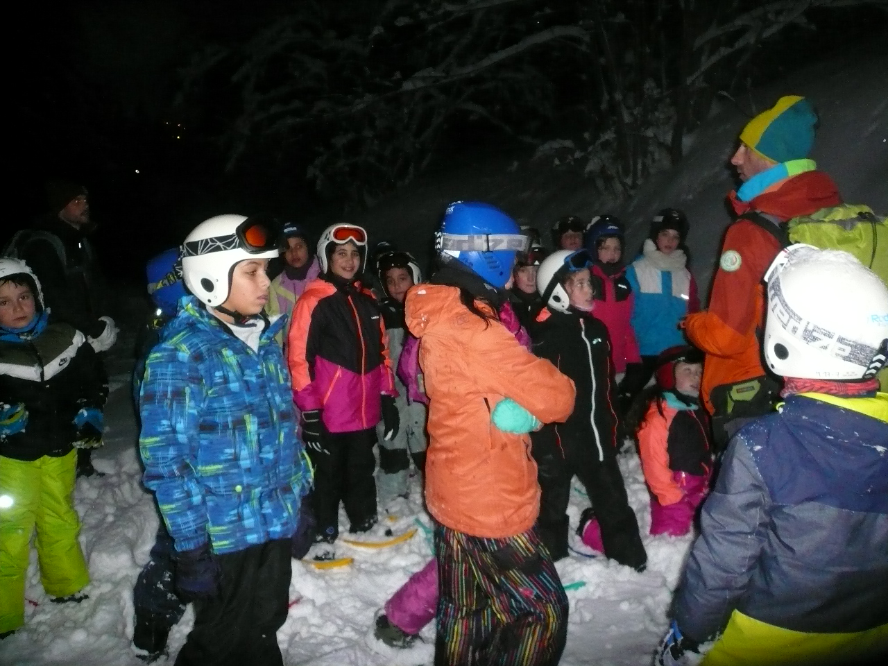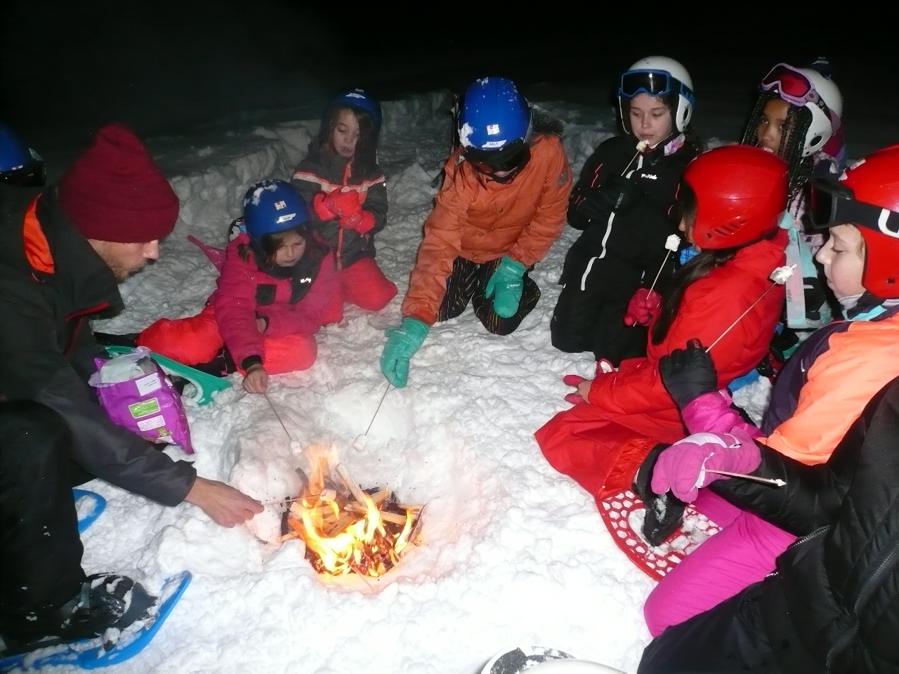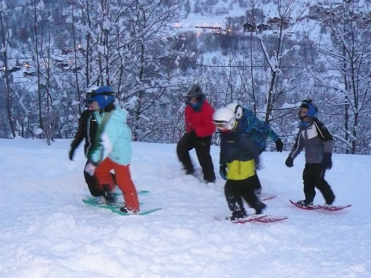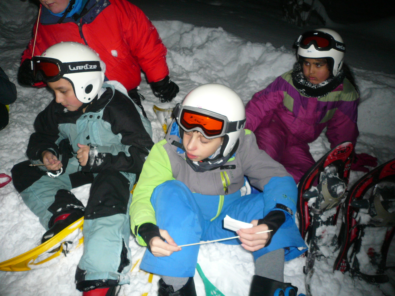 Et enfin la veillée la plus attendue de tous: la balade nocturne en raquettes ! Merci à notre guide Pierre, c'était génial, au-delà de nos espérances ! Imaginez l'ambiance: chausser les raquettes à la tombée de la nuit, faire la trace dans 50 cm de poudreuse fraîchement tombée, tous à la queue leu leu éclairés par les lueurs du ciel, atteindre une petite clairière, faire coucou à la lune et à Vénus (étoile du berger), damer une petite terrasse sous un mélèze, allumer un feu, boire une petite boisson à la fraise ou à l'orange, faire griller des chamallows, réciter la poésie de Samivel "Les merveilles de la montagne ne coûtent pas un centime" et surtout ressentir tout ce que nous dit ce grand poète "écouter les musiques de la montagne"... puis redescendre vers le centre en enchaînant les glissades... Quel bonheur de partager ce moment tous ensemble !