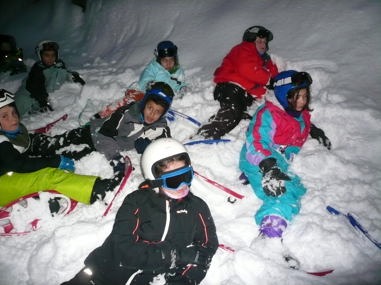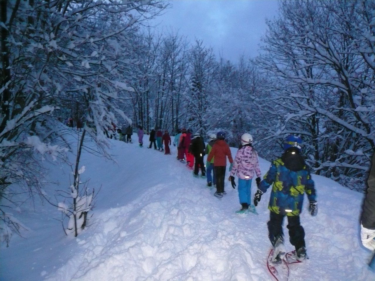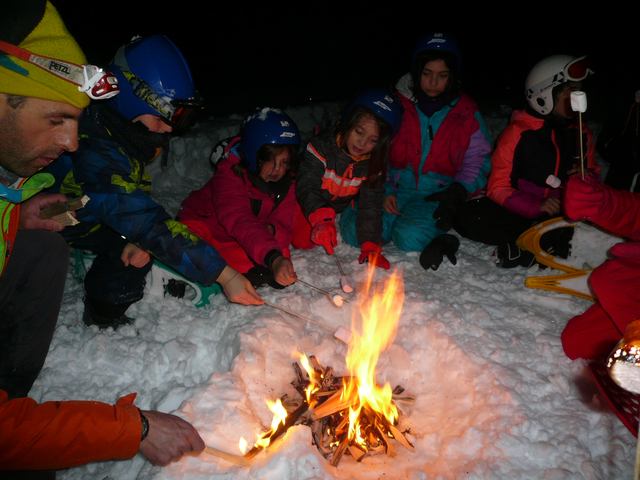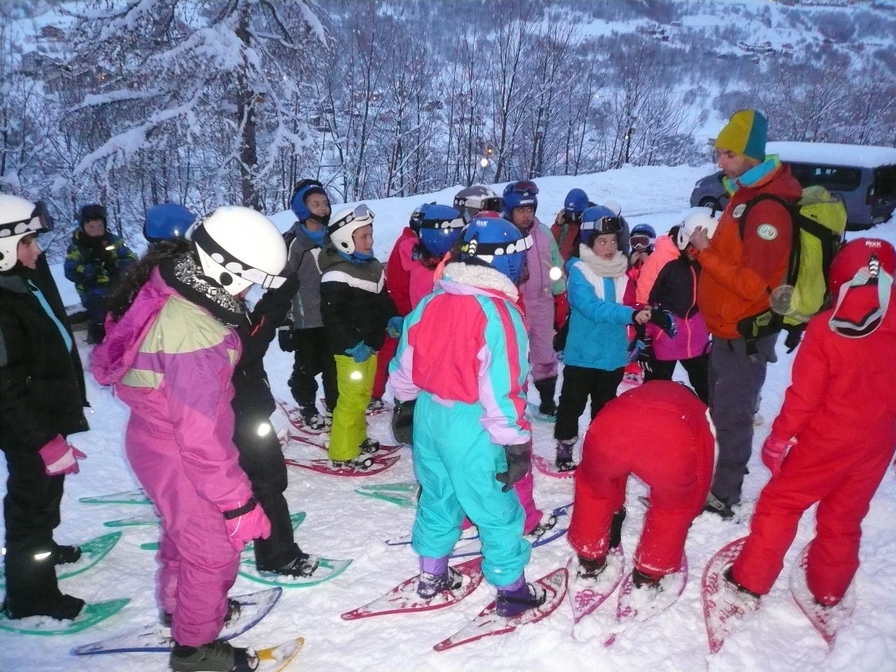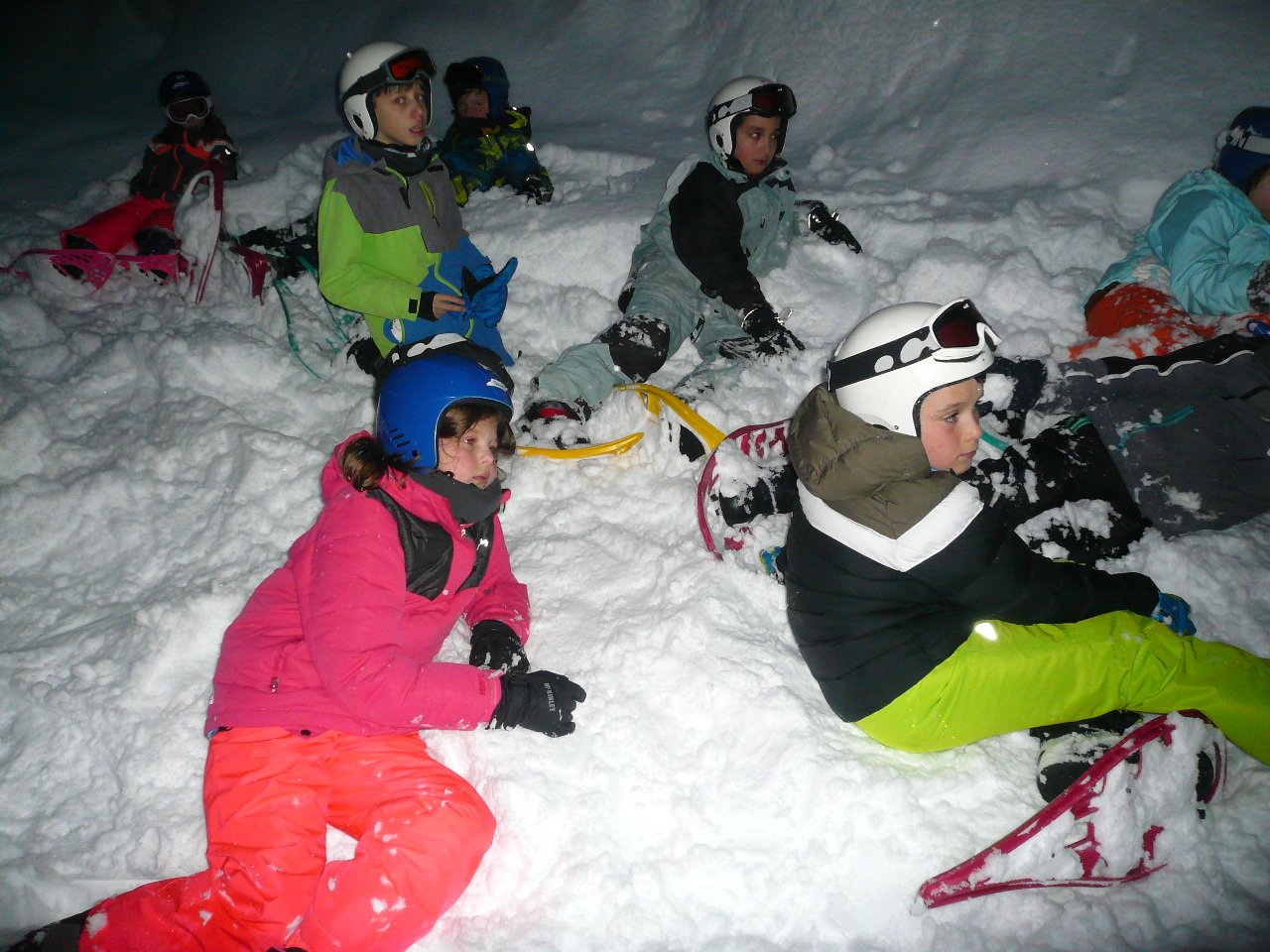 Et enfin la veillée la plus attendue de tous: la balade nocturne en raquettes ! Merci à notre guide Pierre, c'était génial, au-delà de nos espérances ! Imaginez l'ambiance: chausser les raquettes à la tombée de la nuit, faire la trace dans 50 cm de poudreuse fraîchement tombée, tous à la queue leu leu éclairés par les lueurs du ciel, atteindre une petite clairière, faire coucou à la lune et à Vénus (étoile du berger), damer une petite terrasse sous un mélèze, allumer un feu, boire une petite boisson à la fraise ou à l'orange, faire griller des chamallows, réciter la poésie de Samivel "Les merveilles de la montagne ne coûtent pas un centime" et surtout ressentir tout ce que nous dit ce grand poète "écouter les musiques de la montagne"... puis redescendre vers le centre en enchaînant les glissades... Quel bonheur de partager ce moment tous ensemble !