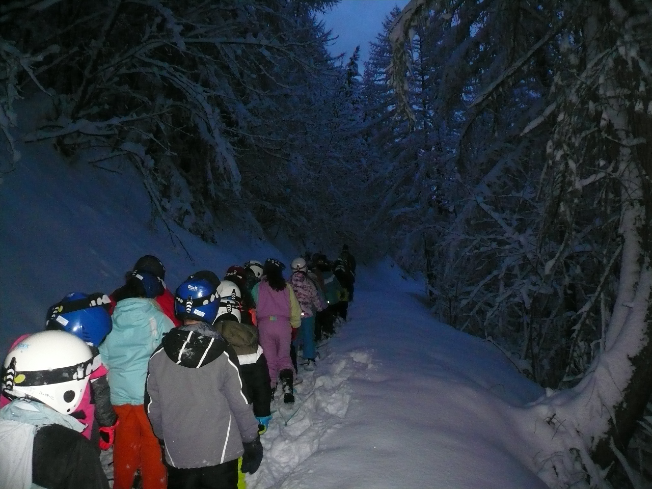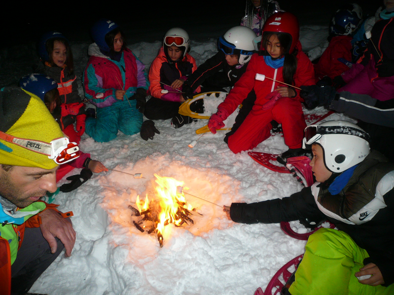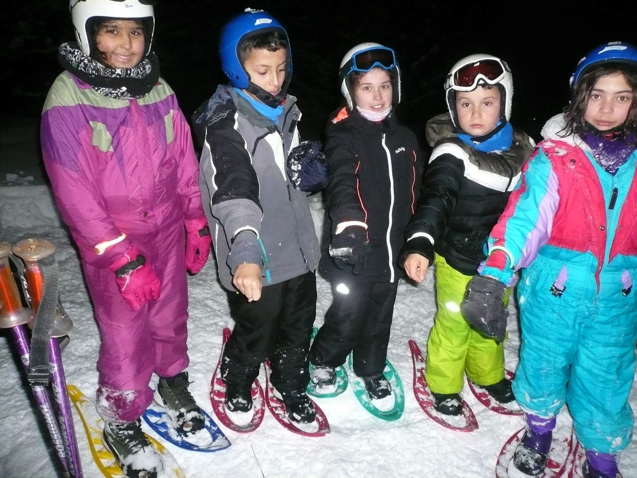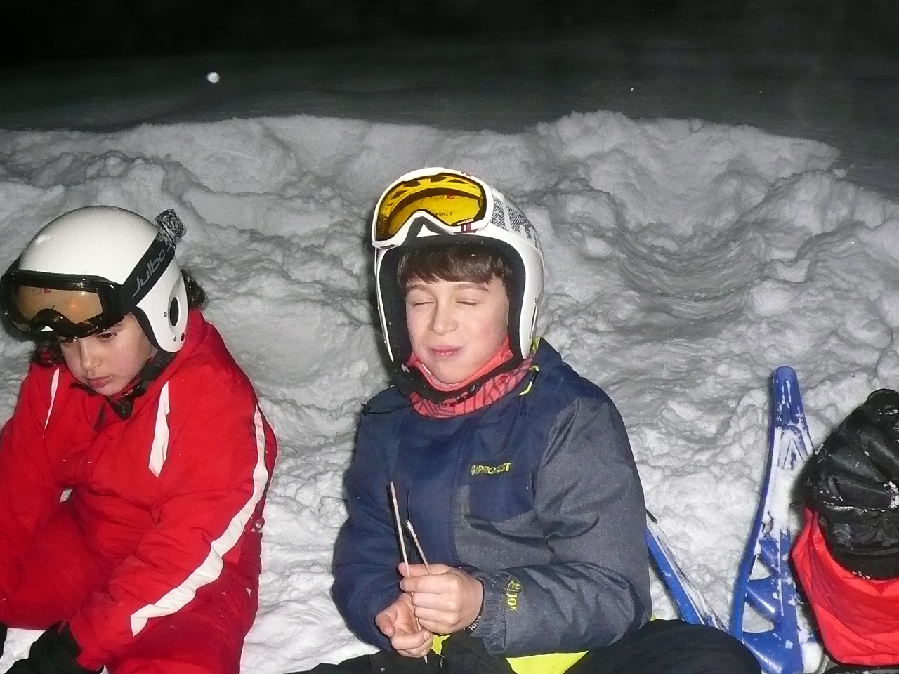 Et enfin la veillée la plus attendue de tous: la balade nocturne en raquettes ! Merci à notre guide Pierre, c'était génial, au-delà de nos espérances ! Imaginez l'ambiance: chausser les raquettes à la tombée de la nuit, faire la trace dans 50 cm de poudreuse fraîchement tombée, tous à la queue leu leu éclairés par les lueurs du ciel, atteindre une petite clairière, faire coucou à la lune et à Vénus (étoile du berger), damer une petite terrasse sous un mélèze, allumer un feu, boire une petite boisson à la fraise ou à l'orange, faire griller des chamallows, réciter la poésie de Samivel "Les merveilles de la montagne ne coûtent pas un centime" et surtout ressentir tout ce que nous dit ce grand poète "écouter les musiques de la montagne"... puis redescendre vers le centre en enchaînant les glissades... Quel bonheur de partager ce moment tous ensemble !
