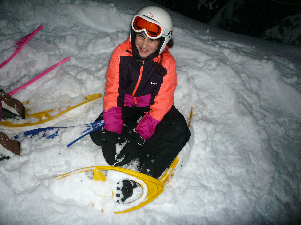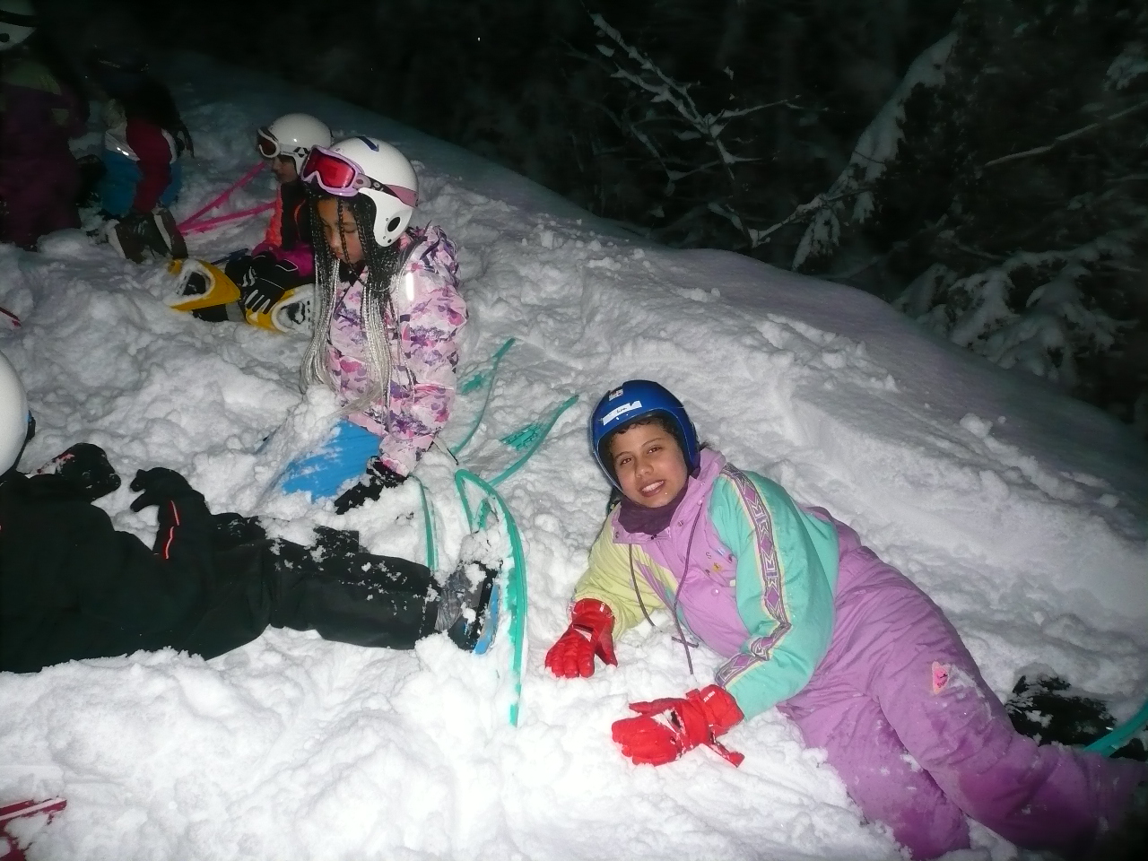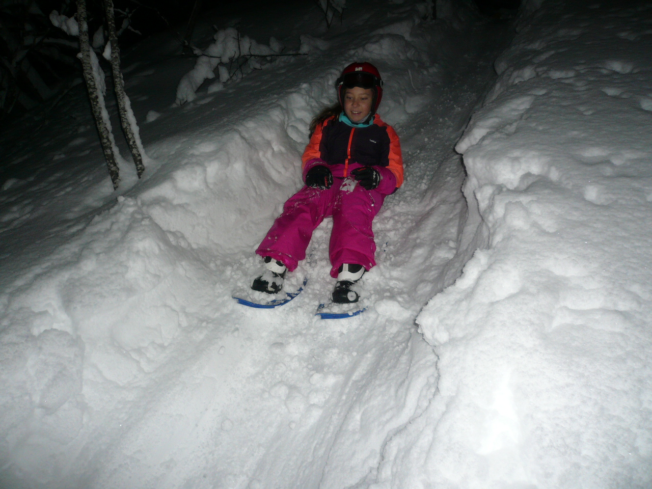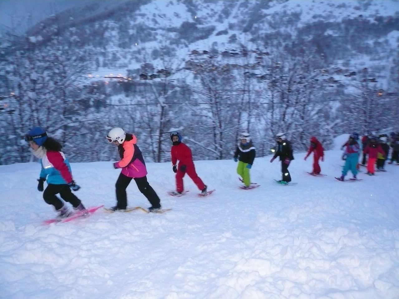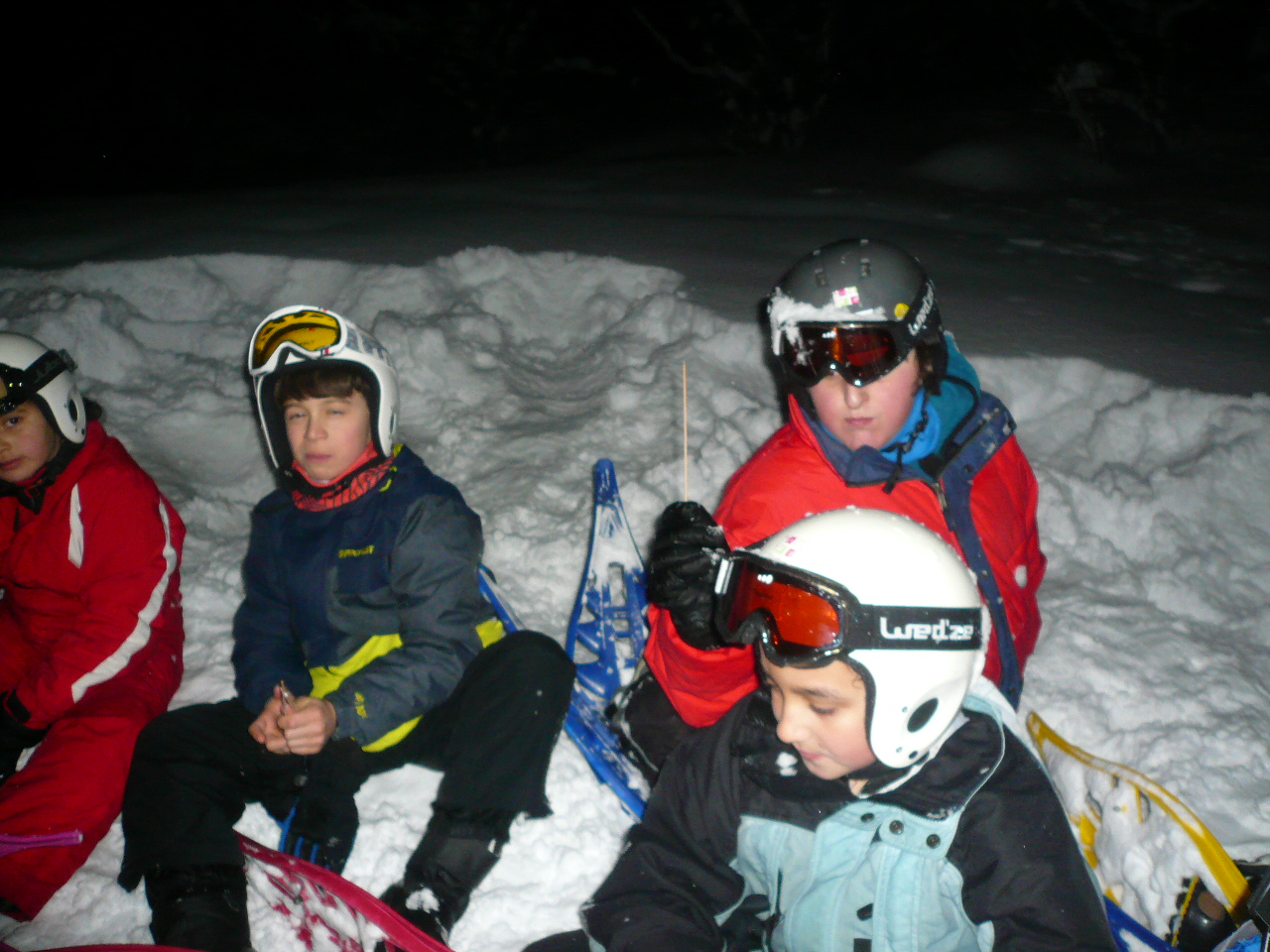 Et enfin la veillée la plus attendue de tous: la balade nocturne en raquettes ! Merci à notre guide Pierre, c'était génial, au-delà de nos espérances ! Imaginez l'ambiance: chausser les raquettes à la tombée de la nuit, faire la trace dans 50 cm de poudreuse fraîchement tombée, tous à la queue leu leu éclairés par les lueurs du ciel, atteindre une petite clairière, faire coucou à la lune et à Vénus (étoile du berger), damer une petite terrasse sous un mélèze, allumer un feu, boire une petite boisson à la fraise ou à l'orange, faire griller des chamallows, réciter la poésie de Samivel "Les merveilles de la montagne ne coûtent pas un centime" et surtout ressentir tout ce que nous dit ce grand poète "écouter les musiques de la montagne"... puis redescendre vers le centre en enchaînant les glissades... Quel bonheur de partager ce moment tous ensemble !