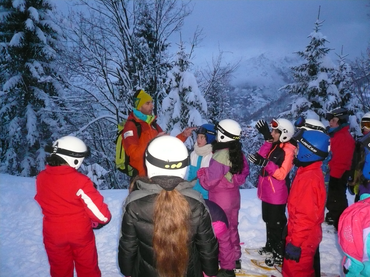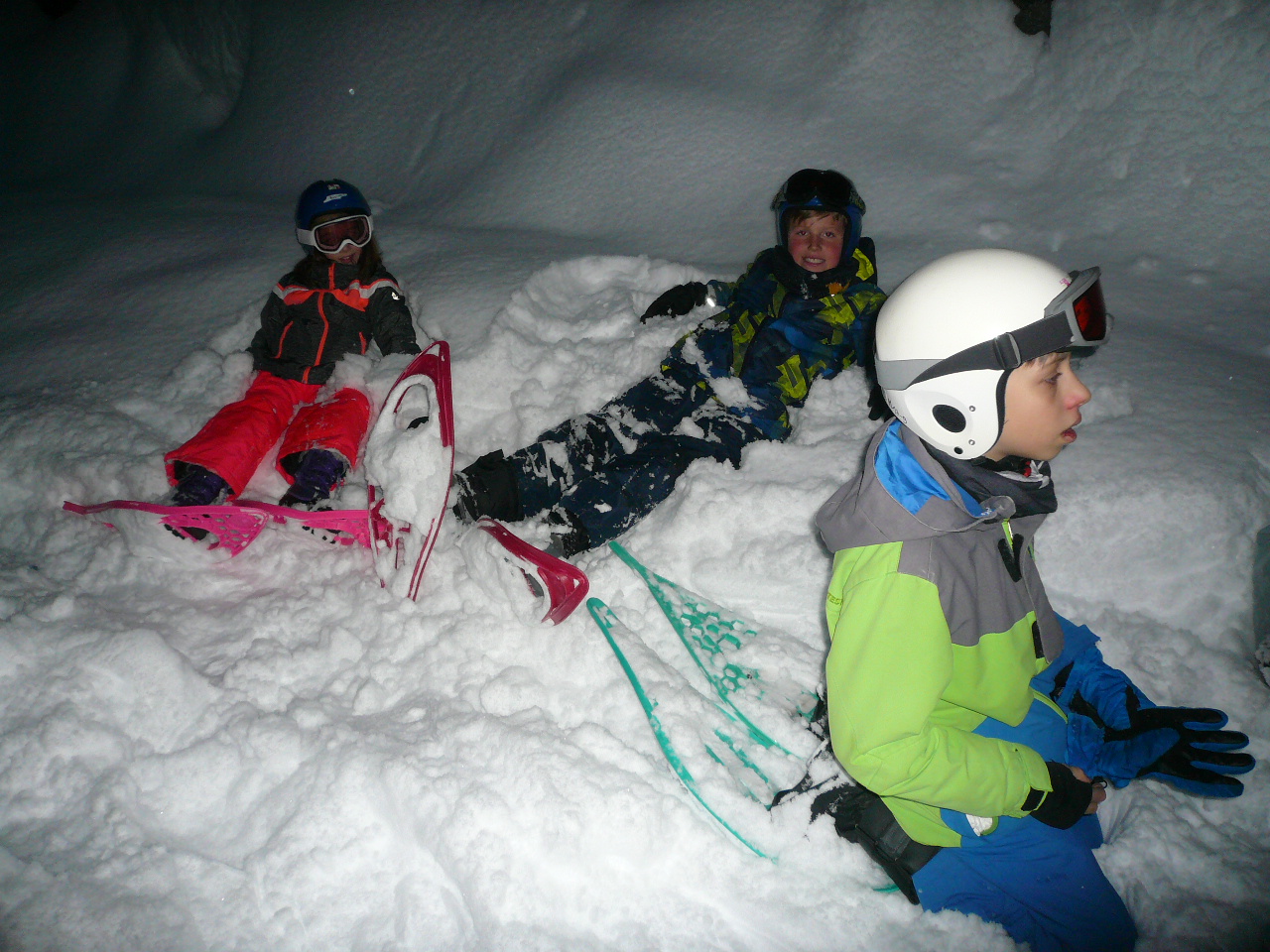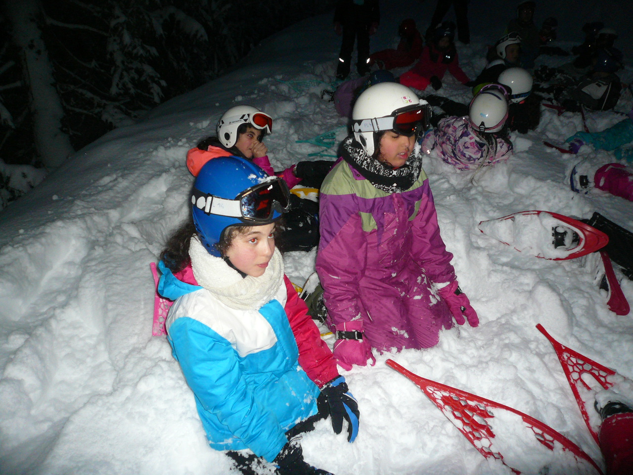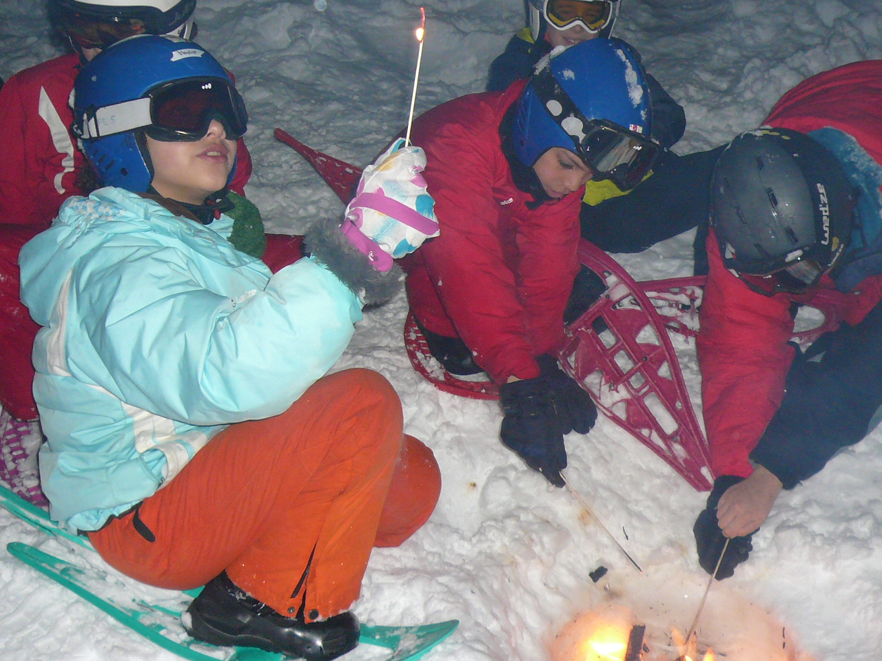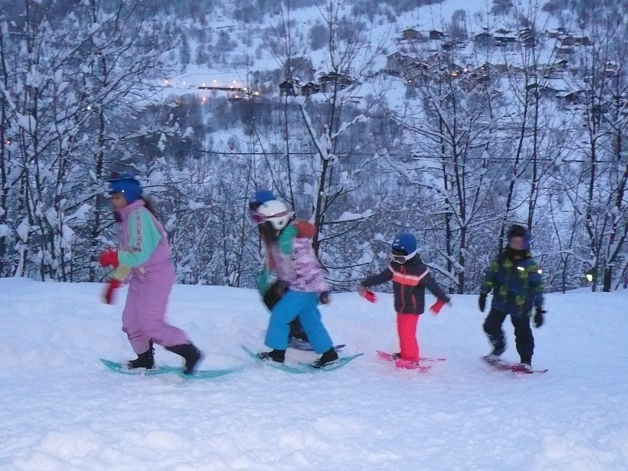 Et enfin la veillée la plus attendue de tous: la balade nocturne en raquettes ! Merci à notre guide Pierre, c'était génial, au-delà de nos espérances ! Imaginez l'ambiance: chausser les raquettes à la tombée de la nuit, faire la trace dans 50 cm de poudreuse fraîchement tombée, tous à la queue leu leu éclairés par les lueurs du ciel, atteindre une petite clairière, faire coucou à la lune et à Vénus (étoile du berger), damer une petite terrasse sous un mélèze, allumer un feu, boire une petite boisson à la fraise ou à l'orange, faire griller des chamallows, réciter la poésie de Samivel "Les merveilles de la montagne ne coûtent pas un centime" et surtout ressentir tout ce que nous dit ce grand poète "écouter les musiques de la montagne"... puis redescendre vers le centre en enchaînant les glissades... Quel bonheur de partager ce moment tous ensemble !