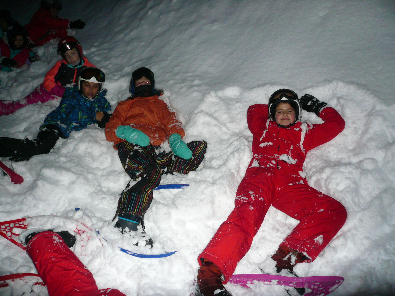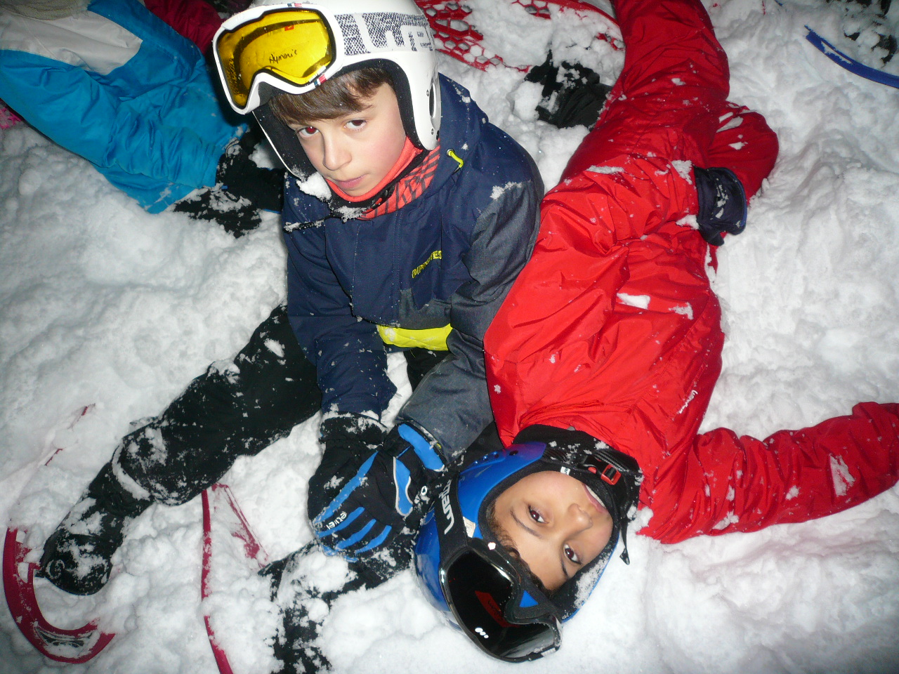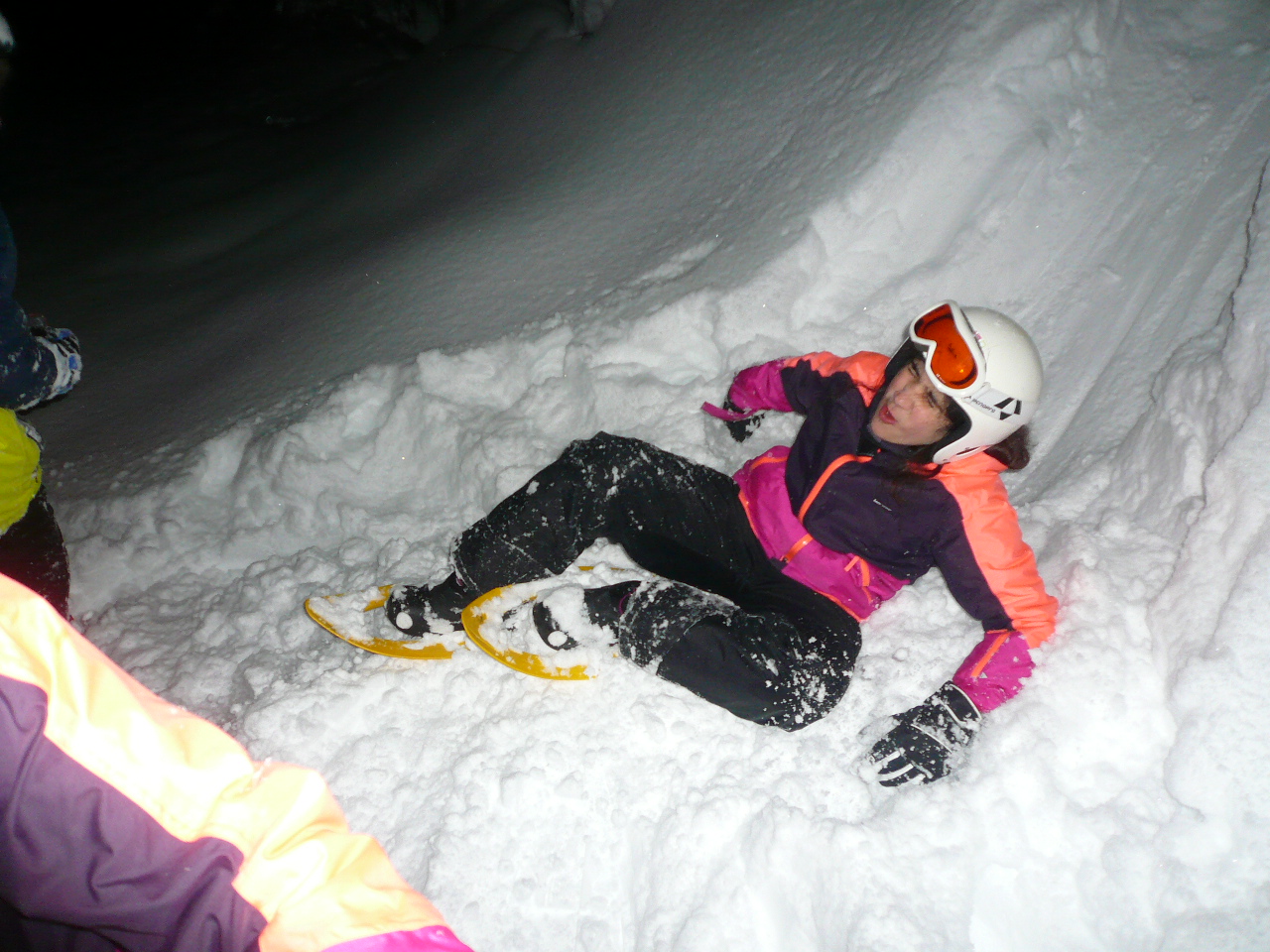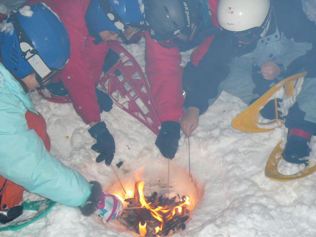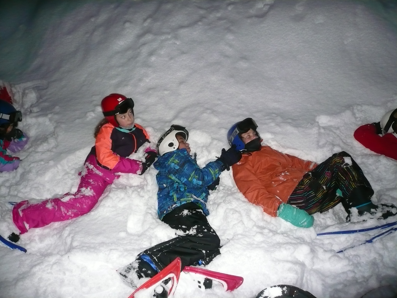 Et enfin la veillée la plus attendue de tous: la balade nocturne en raquettes ! Merci à notre guide Pierre, c'était génial, au-delà de nos espérances ! Imaginez l'ambiance: chausser les raquettes à la tombée de la nuit, faire la trace dans 50 cm de poudreuse fraîchement tombée, tous à la queue leu leu éclairés par les lueurs du ciel, atteindre une petite clairière, faire coucou à la lune et à Vénus (étoile du berger), damer une petite terrasse sous un mélèze, allumer un feu, boire une petite boisson à la fraise ou à l'orange, faire griller des chamallows, réciter la poésie de Samivel "Les merveilles de la montagne ne coûtent pas un centime" et surtout ressentir tout ce que nous dit ce grand poète "écouter les musiques de la montagne"... puis redescendre vers le centre en enchaînant les glissades... Quel bonheur de partager ce moment tous ensemble !