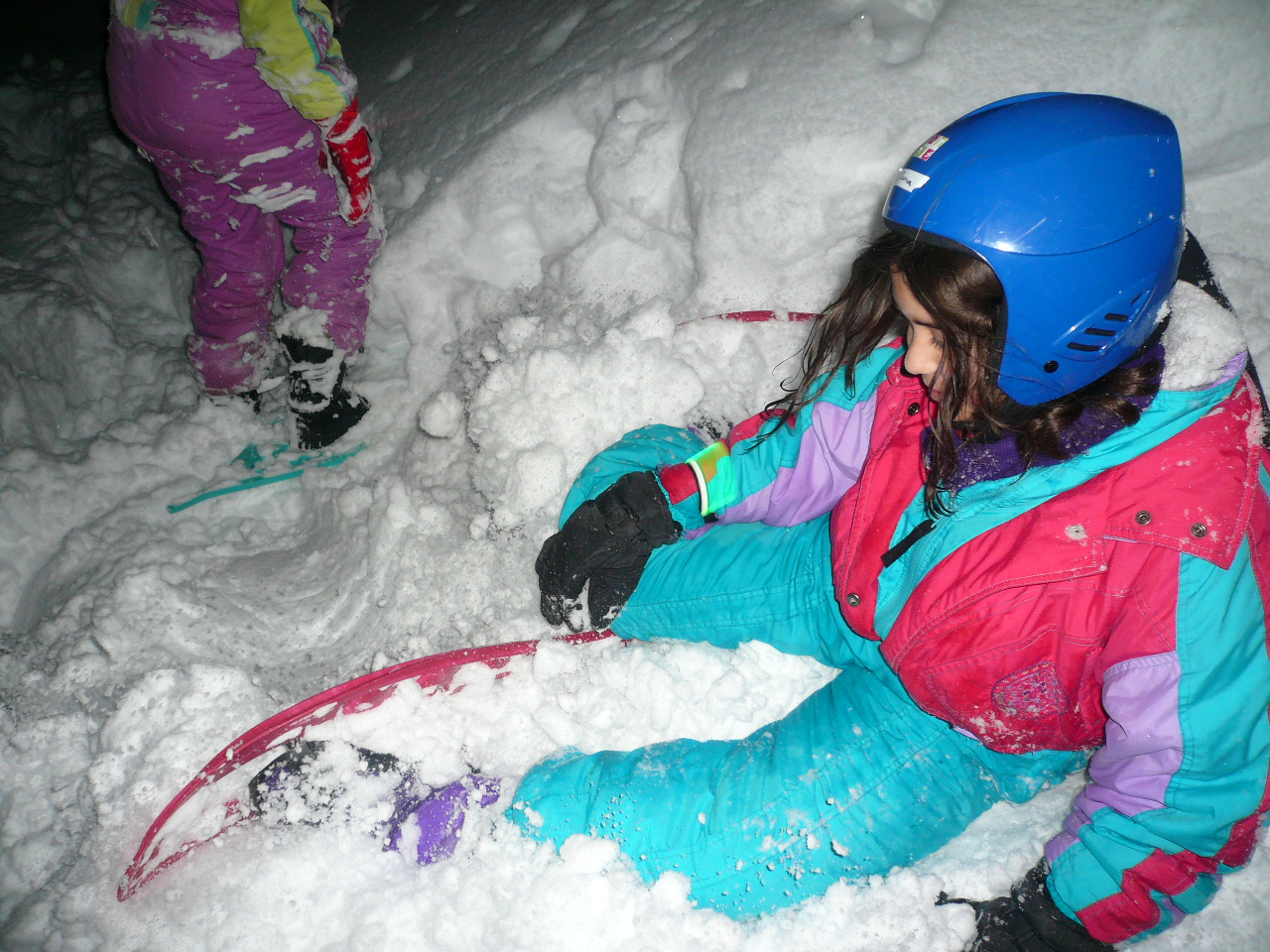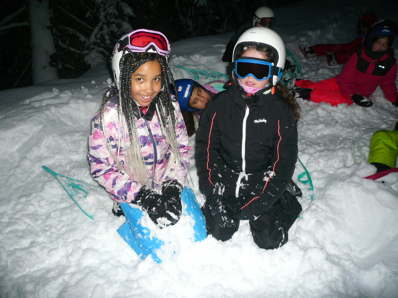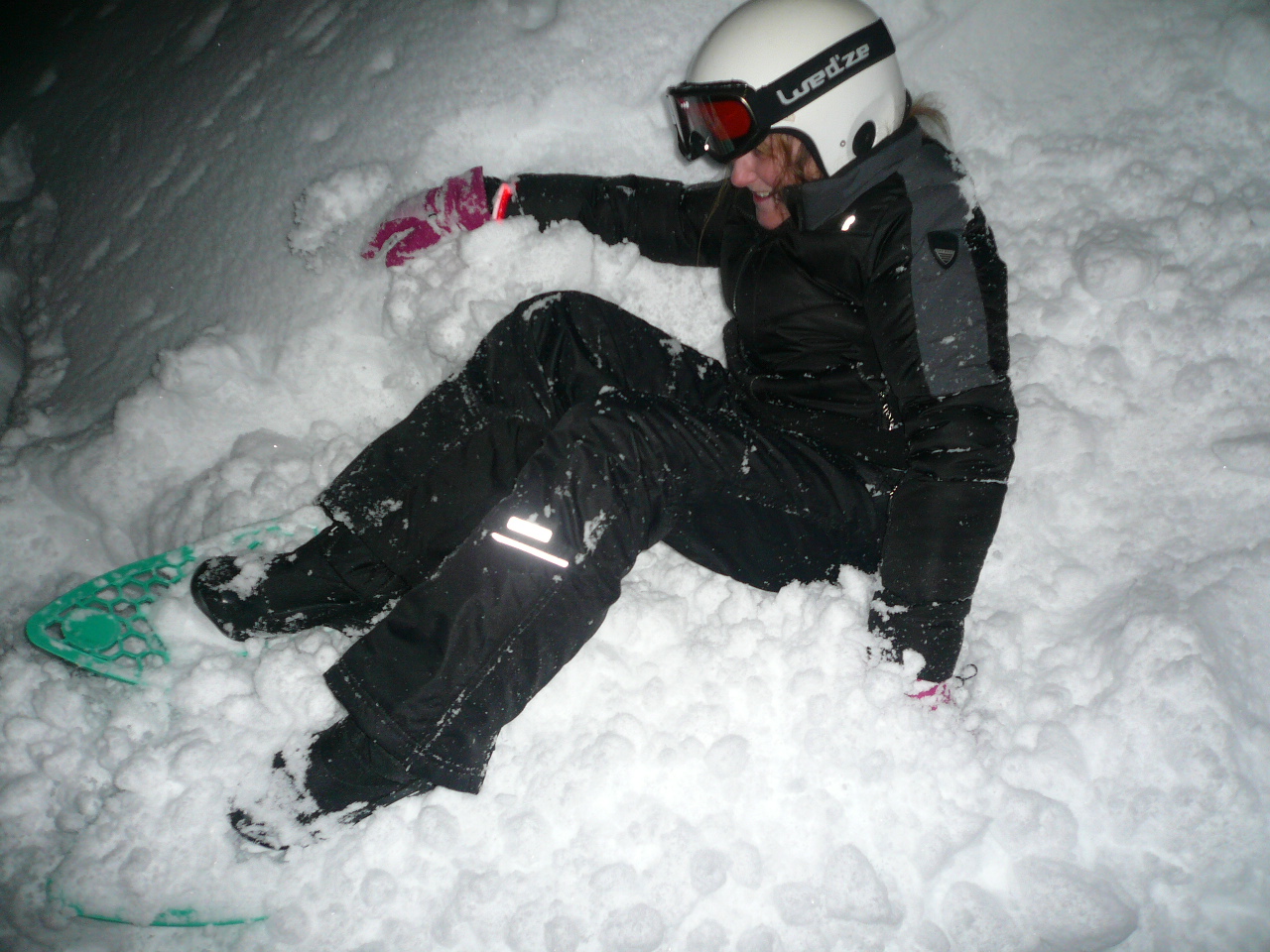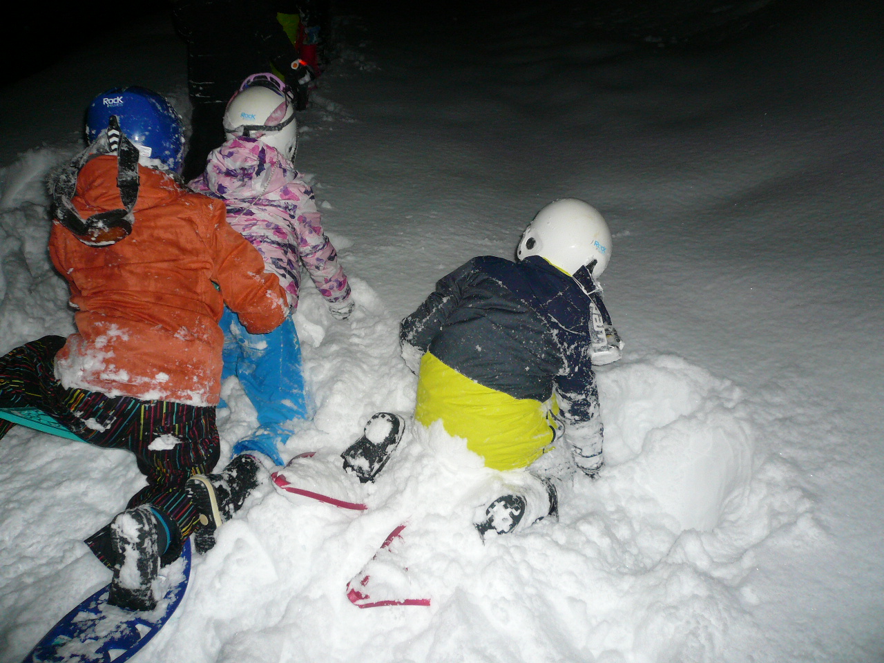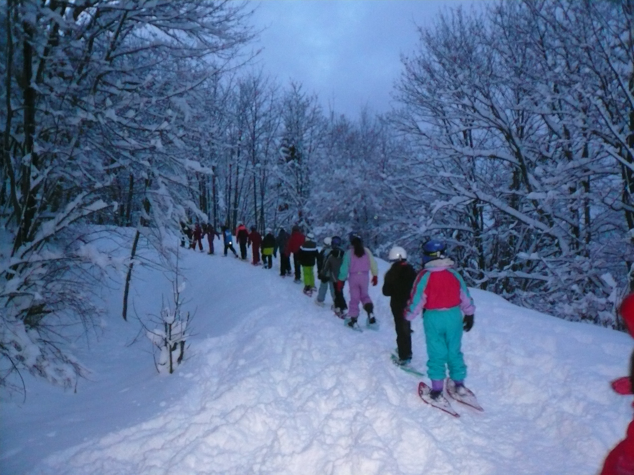 Et enfin la veillée la plus attendue de tous: la balade nocturne en raquettes ! Merci à notre guide Pierre, c'était génial, au-delà de nos espérances ! Imaginez l'ambiance: chausser les raquettes à la tombée de la nuit, faire la trace dans 50 cm de poudreuse fraîchement tombée, tous à la queue leu leu éclairés par les lueurs du ciel, atteindre une petite clairière, faire coucou à la lune et à Vénus (étoile du berger), damer une petite terrasse sous un mélèze, allumer un feu, boire une petite boisson à la fraise ou à l'orange, faire griller des chamallows, réciter la poésie de Samivel "Les merveilles de la montagne ne coûtent pas un centime" et surtout ressentir tout ce que nous dit ce grand poète "écouter les musiques de la montagne"... puis redescendre vers le centre en enchaînant les glissades... Quel bonheur de partager ce moment tous ensemble !