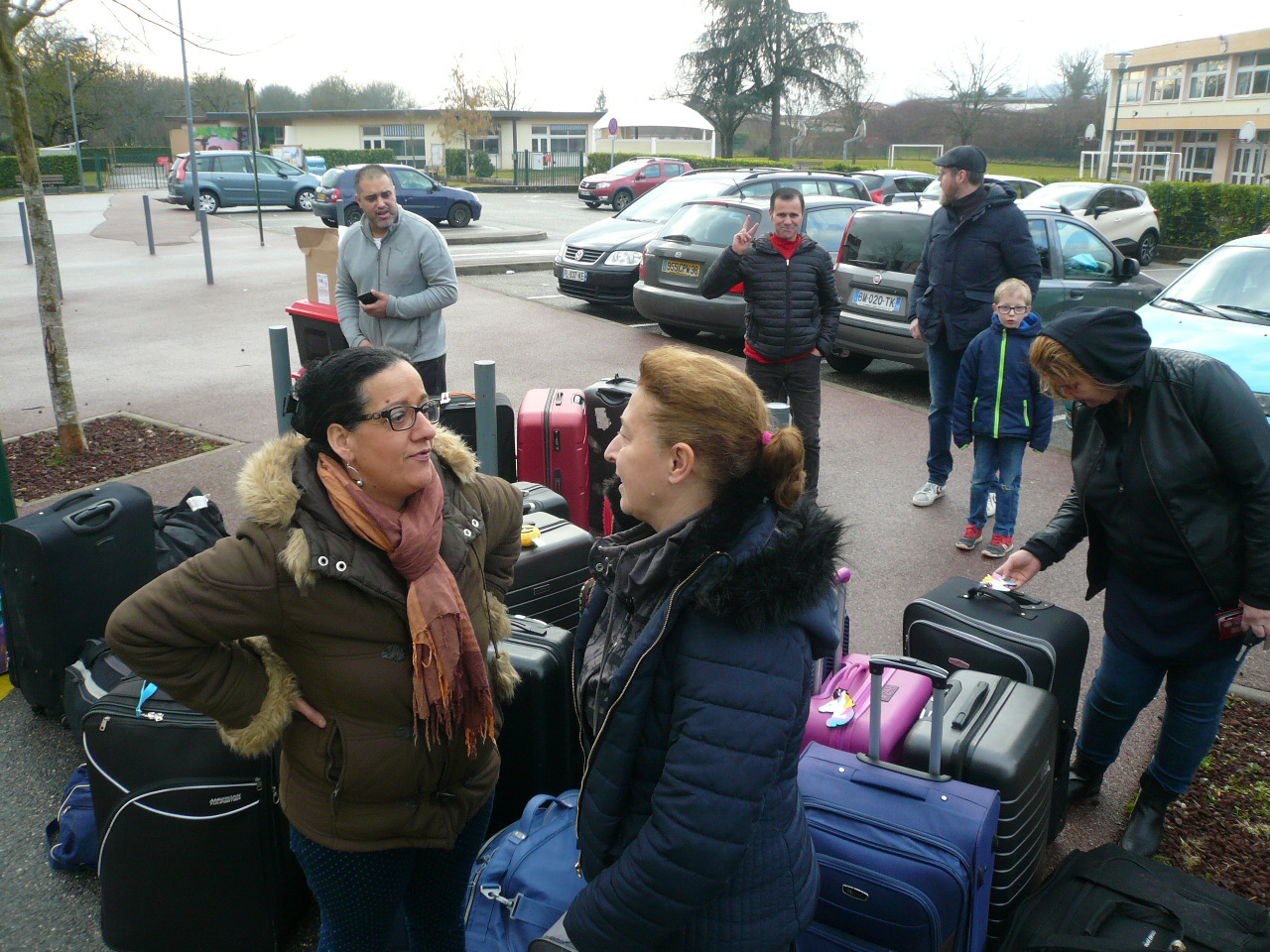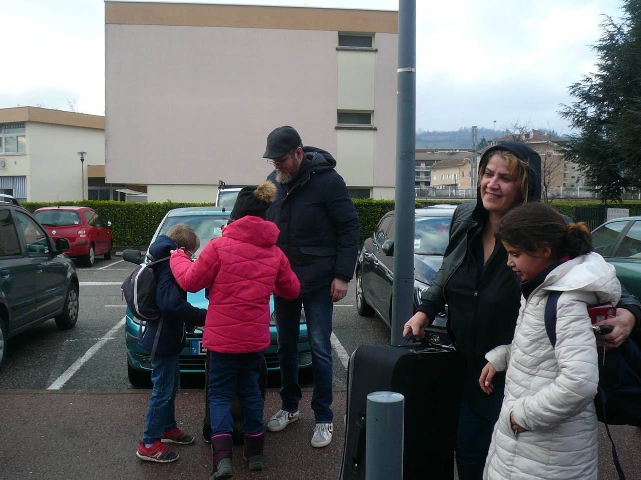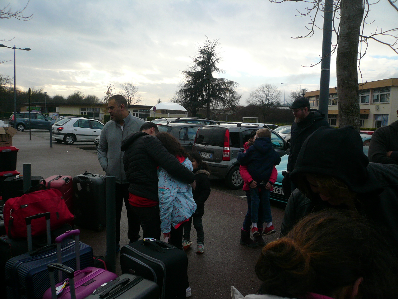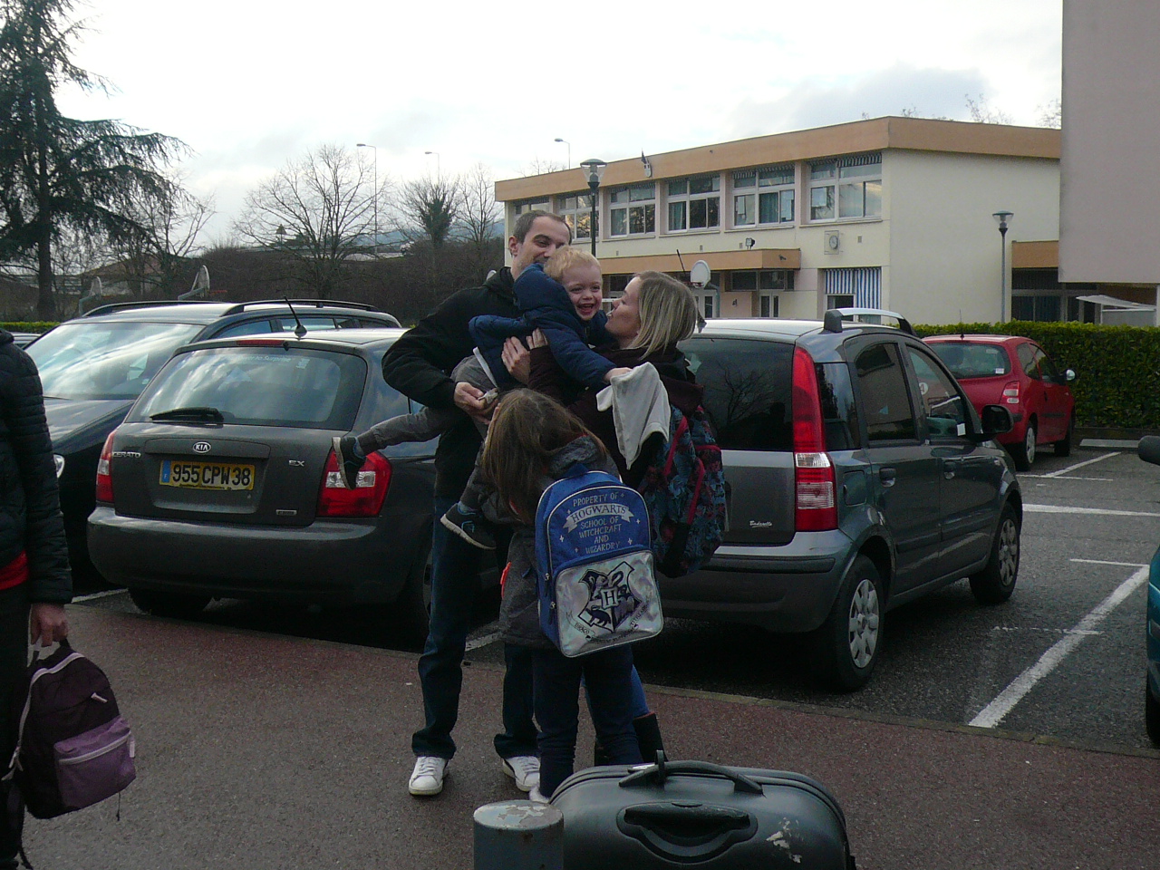 Nous décollons du centre à 13h30. Difficile de vous donner une heure d'arrivée. Cela dépendra des bouchons à Grenoble et des arrêts possibles en route... Au mieux nous serons à l'école à 16h00/16h30...