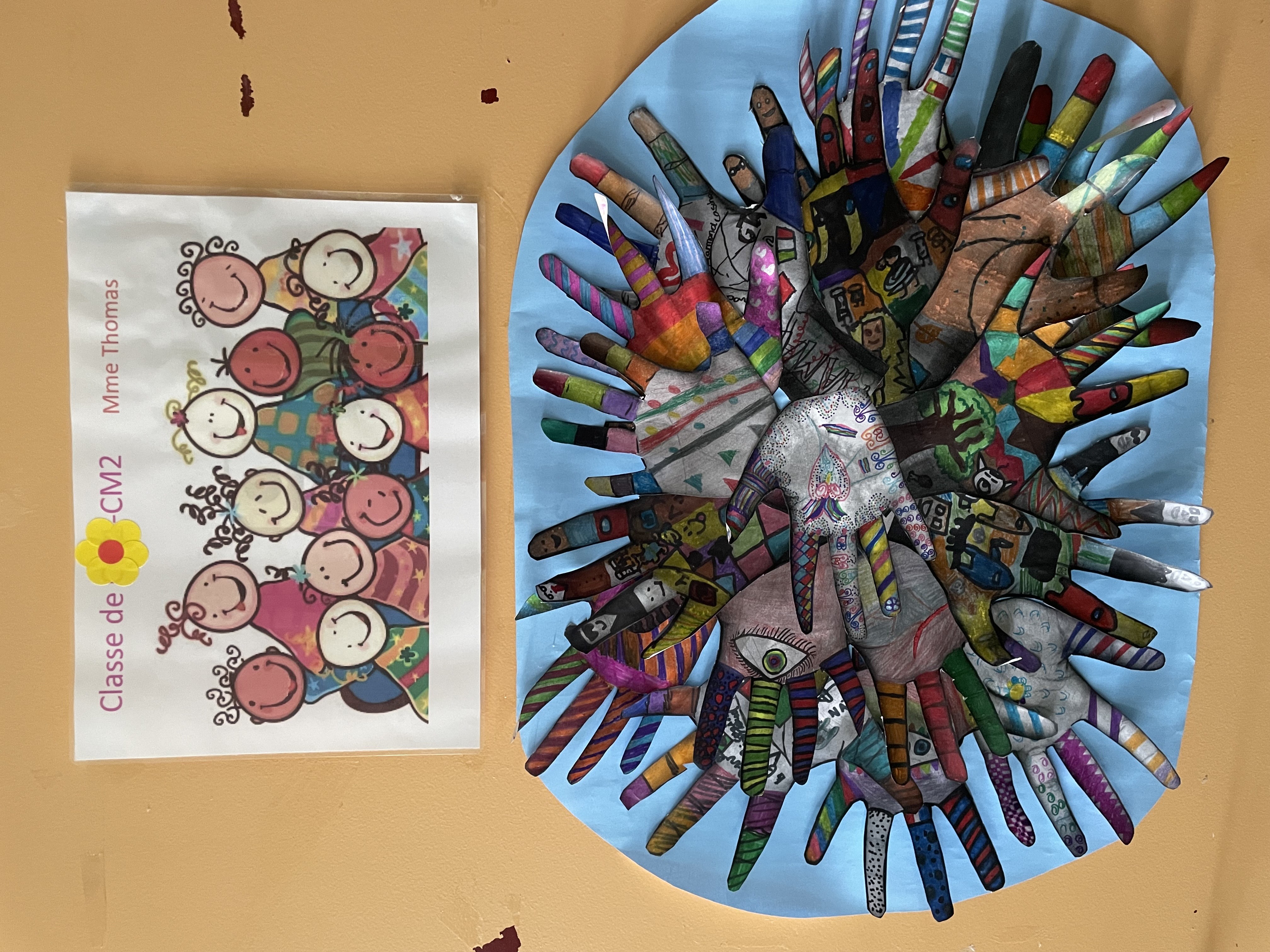La porte de la classe est décorée; chacun a photocopié sa main puis l'a découpée et enfin décorée.