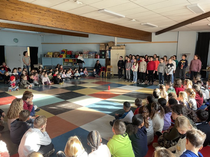 Juste avant les vacances de Noël, tous les élèves de l'école se sont retrouvés pour chanter. Un très beau moment de partage ! Cliquer sur chaque image pour la visualiser en pleine taille