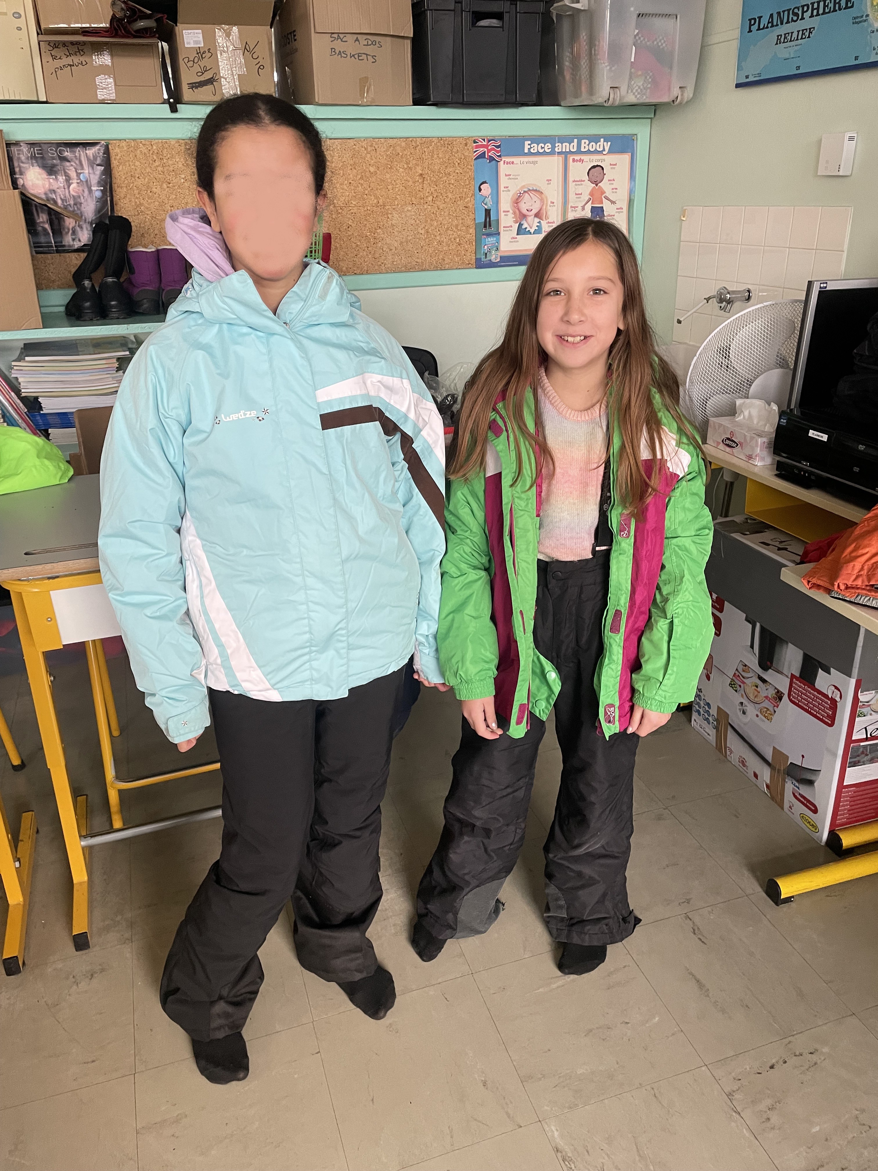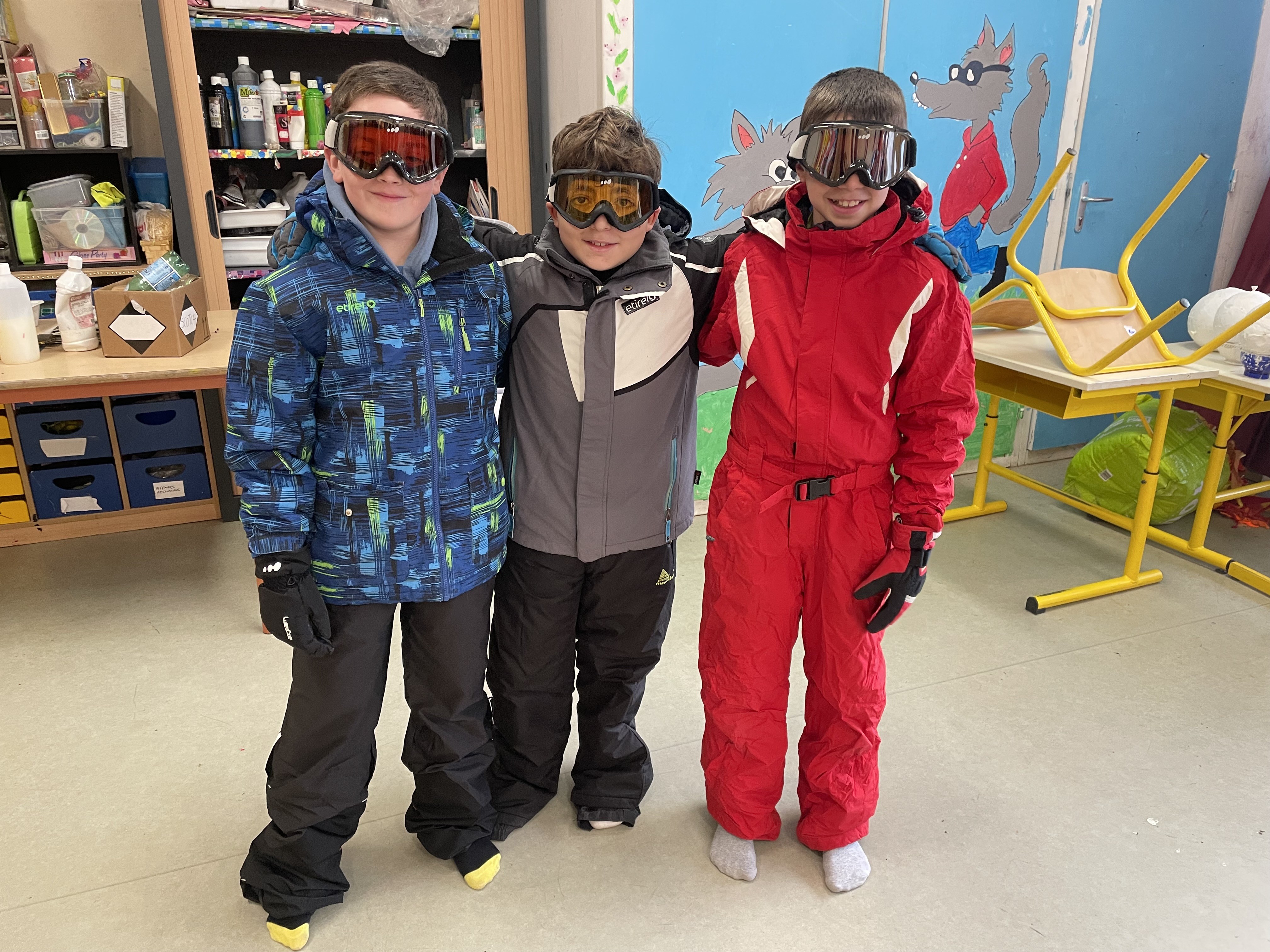 Aujourd'hui les élèves qui le souhaitaient ont pu essayer des tenues de ski de la classe. Ca a été l'occasion d'expliquer comment bien se vêtir pour le ski. Nous avons aussi étudié différents skis et chaussures de la maîtresse: ski de fond, ski de pistes et ski de randonnée. Tous ont été très intéressés et carres et spatules n'ont plus de secret pour eux !