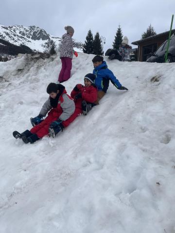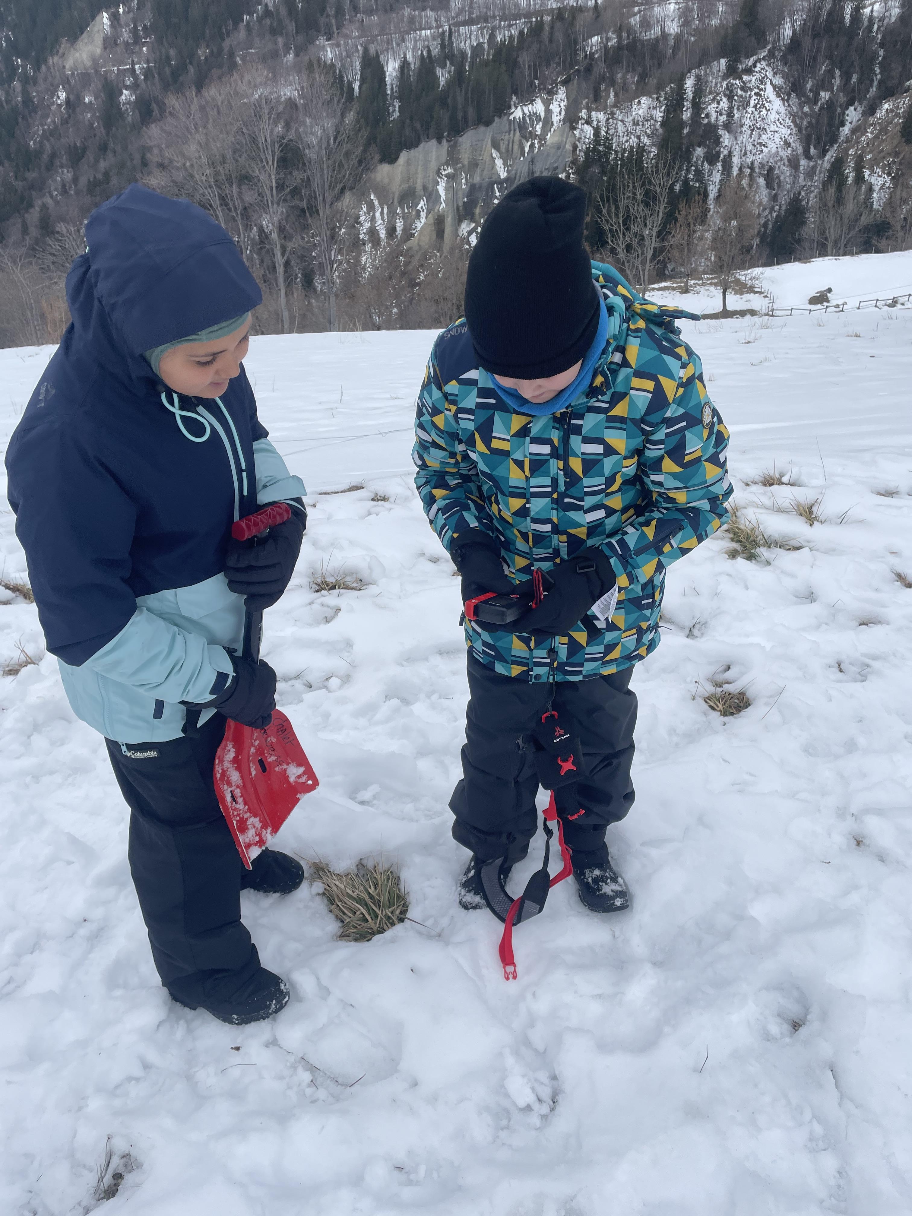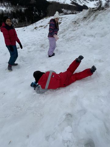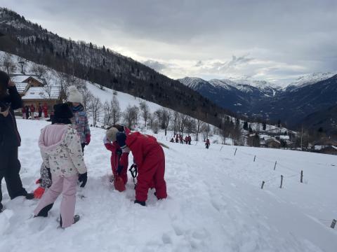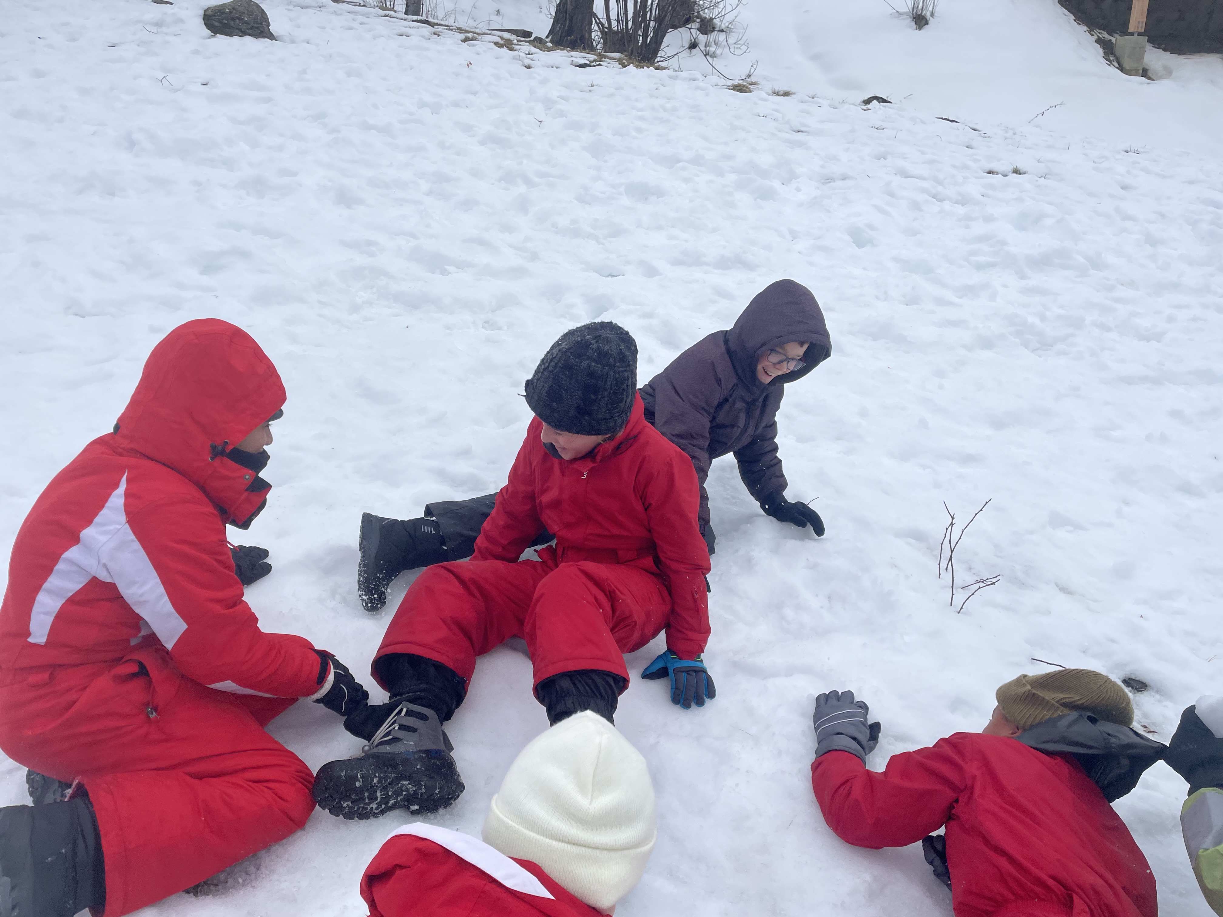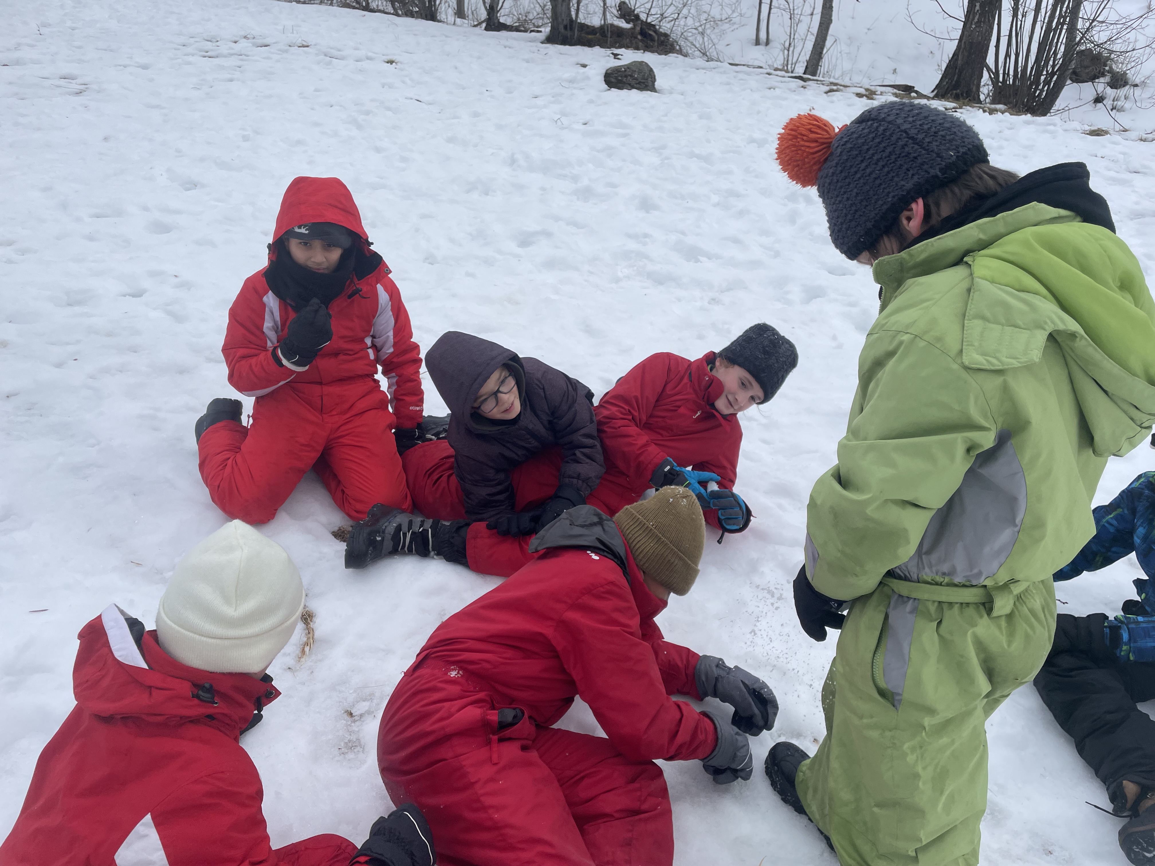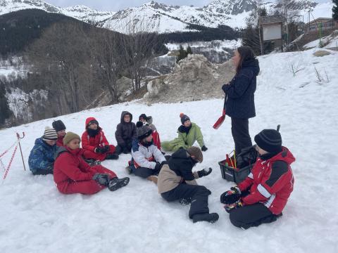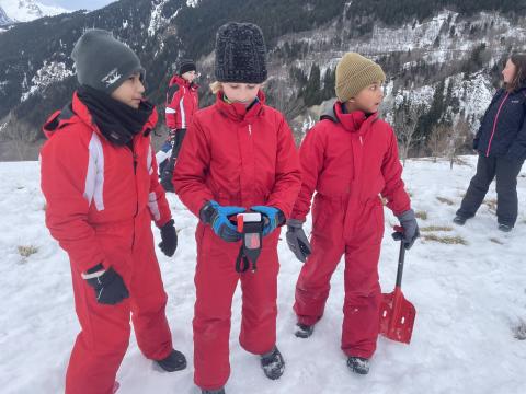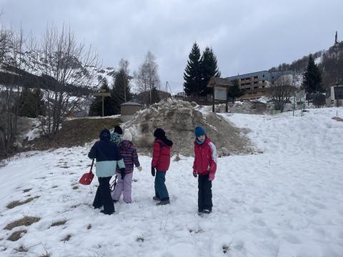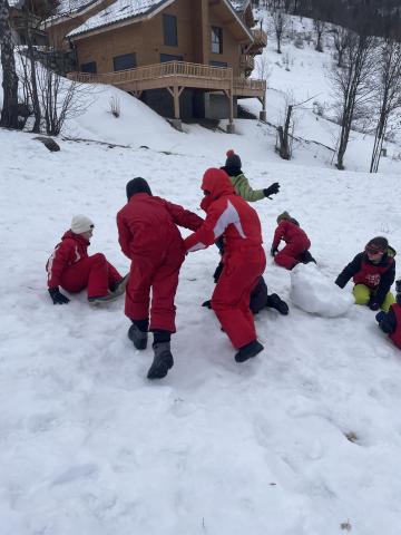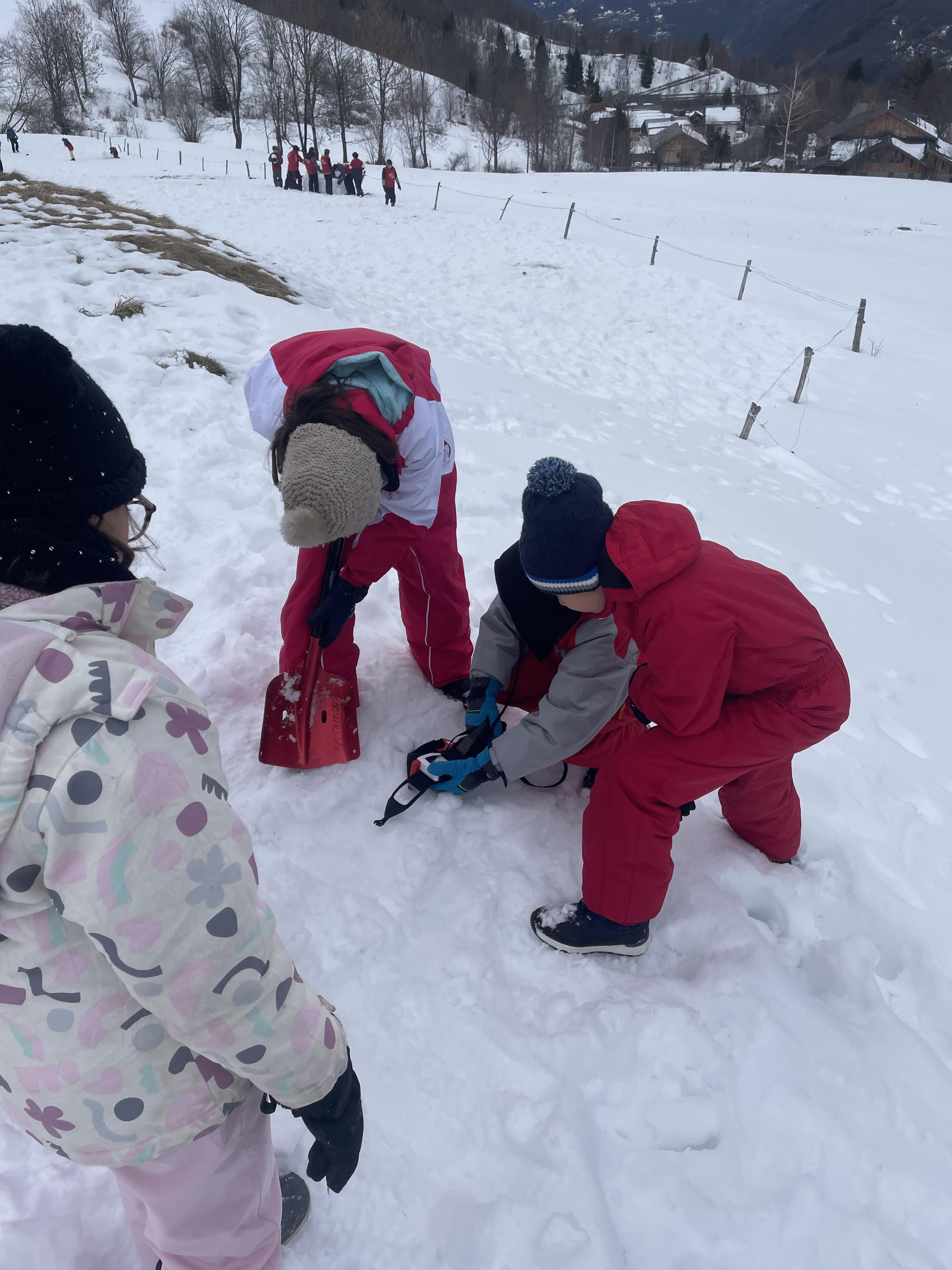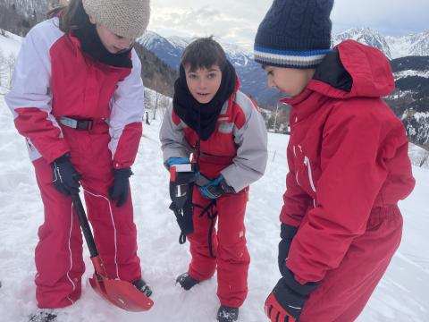 Ce matin nous avons travaillé sur la neige et les avalanches. Nous avons fait une heure de théorie en classe, illustrée par de petites vidéos d'avalanches. Les élèves étaient comme toujours très intéressés. Puis nous sommes passés à la pratique en extérieur. Les élèves ont pu s'entraîner à rechercher une victime sous la neige à l'aide de DVA (Détecteur de Victime d'Avalanche), de sonde et de pelle. Ils ont réussi à sauver tout le monde, OUF !!! Ensuite ils ont pu faire une récré dans la neige: glissades, batailles de boules de neige, sculptures... Une belle matinée !