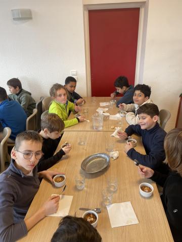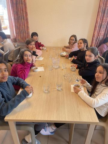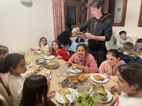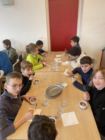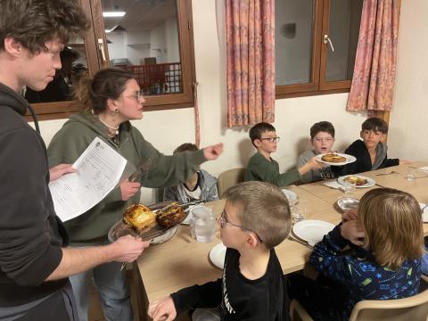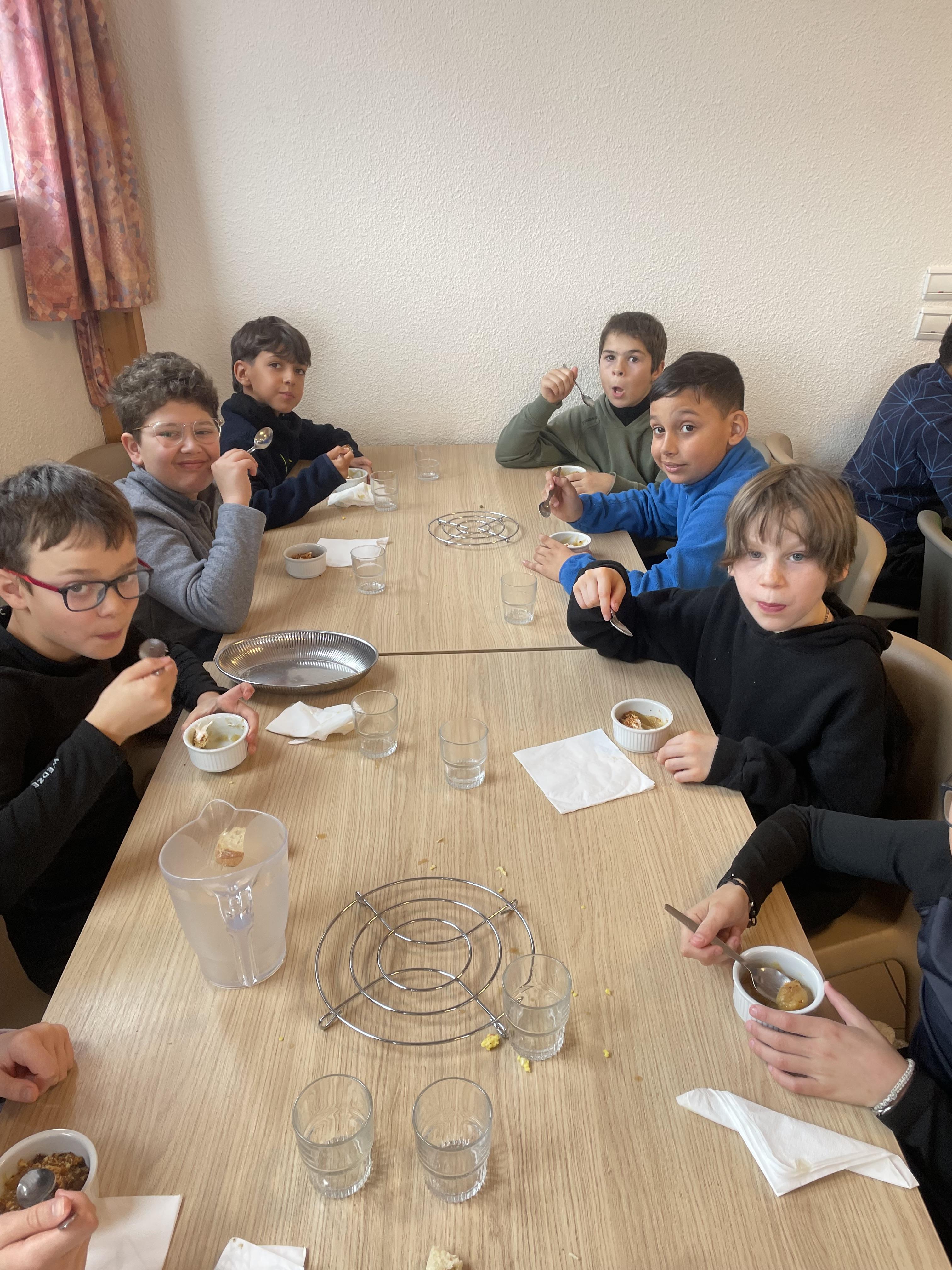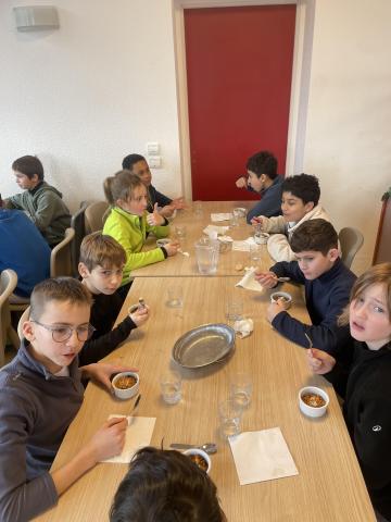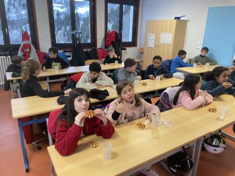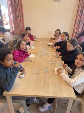 Après un bon repas, c'est reparti pour la 3ème séance de ski. J'en profite pour parler des régimes végétariens, régimes sans viandes, régimes sans porc... En effet un parent pense que son fils végétarien a mangé du boeuf. Ce n'est pas du tout le cas ! Je suis extrêmement vigilante à ce sujet. Quand il y a de la viande, les élèves aux régimes particuliers ont un autre plat. Ils sont appelés et servis individuellement par un adulte, ces plats sont placés à l'écart. Sur le menu que j'ai mis en photo hier soir, seuls les menus classiques sont inscrits. Quand il y a de la viande, vous pouvez voir une petite étoile verte qui veut dire un plat végétal servi à la place ou rouge pour du poisson. J'espère avoir rassuré toutes les familles concernées !