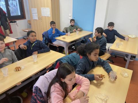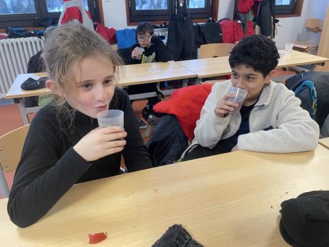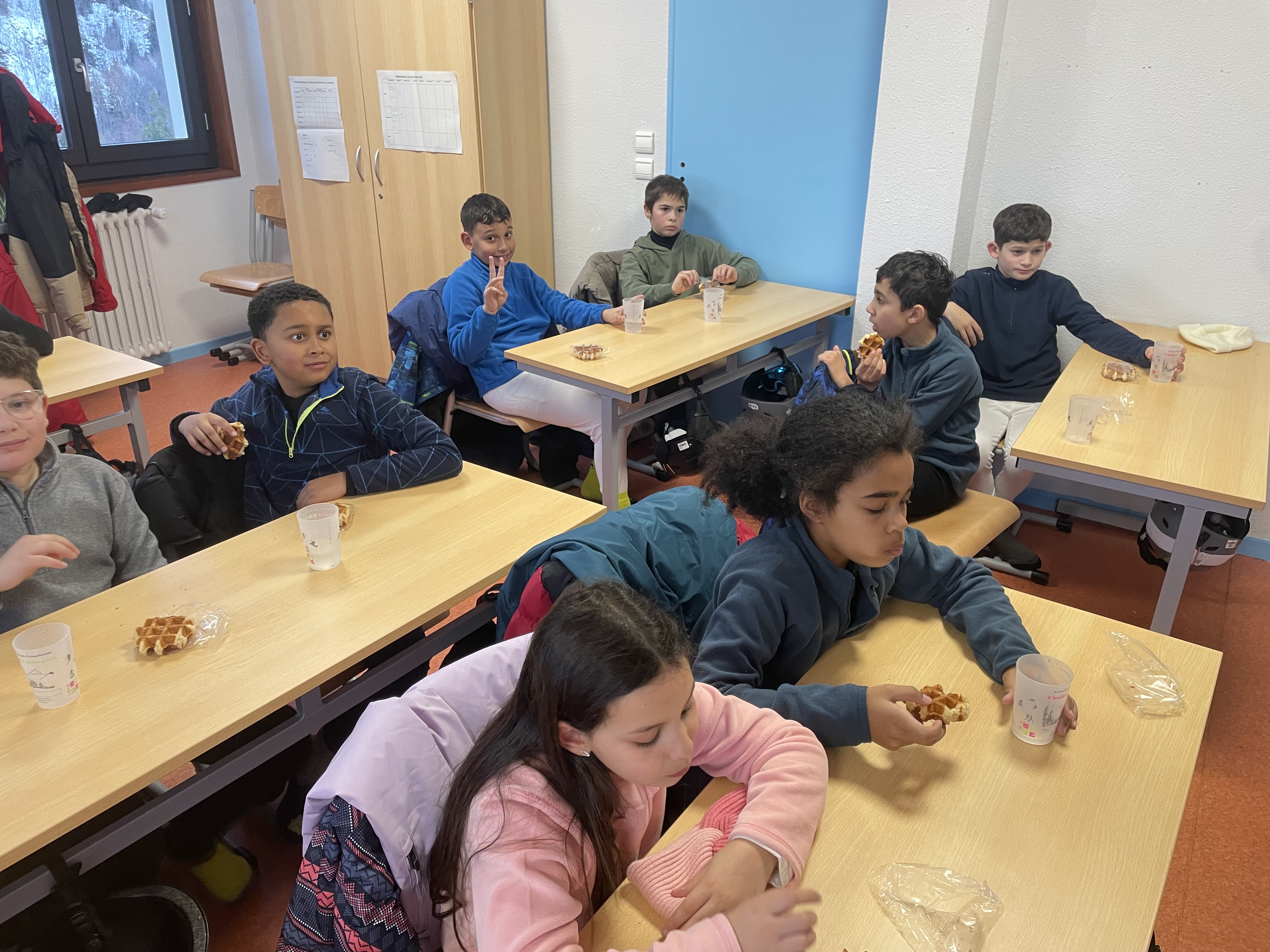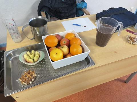 Au goûter aujourd'hui: eau obligatoire, chocolat chaud, gaufre et fruits, MIAM !