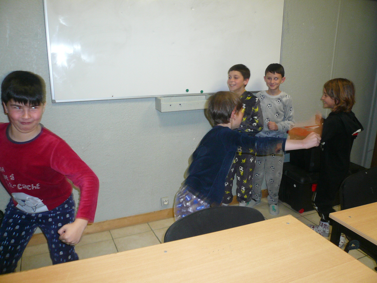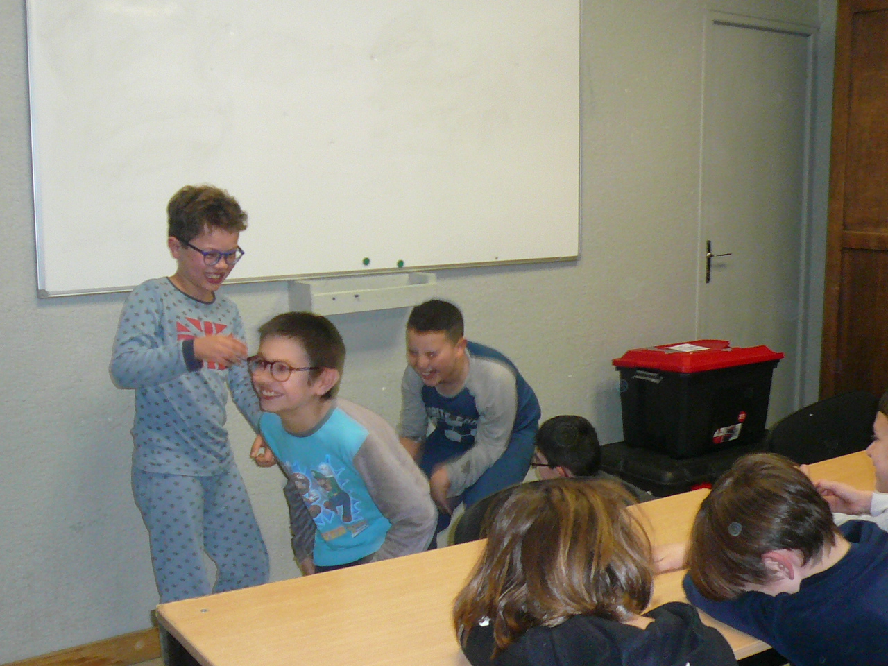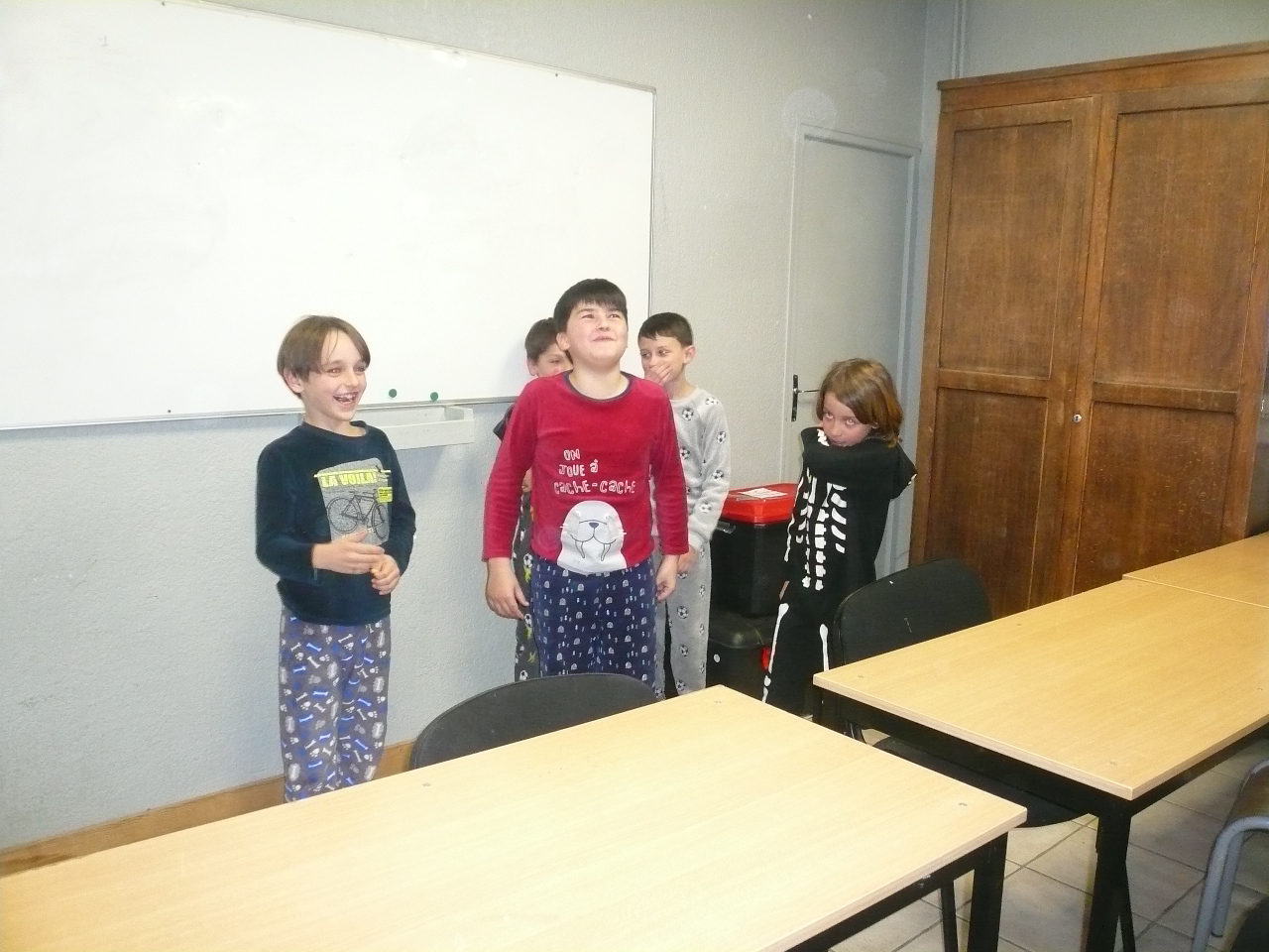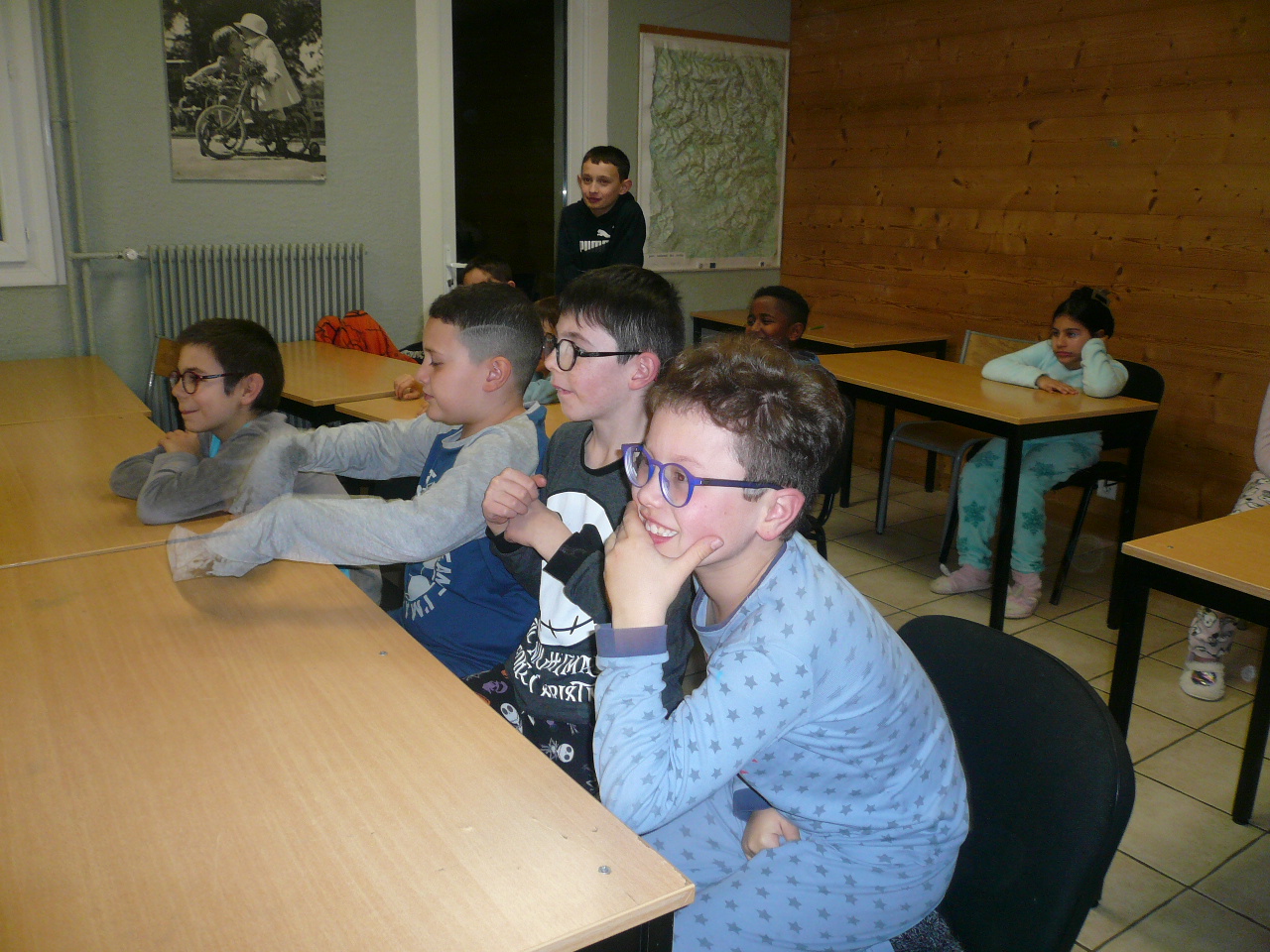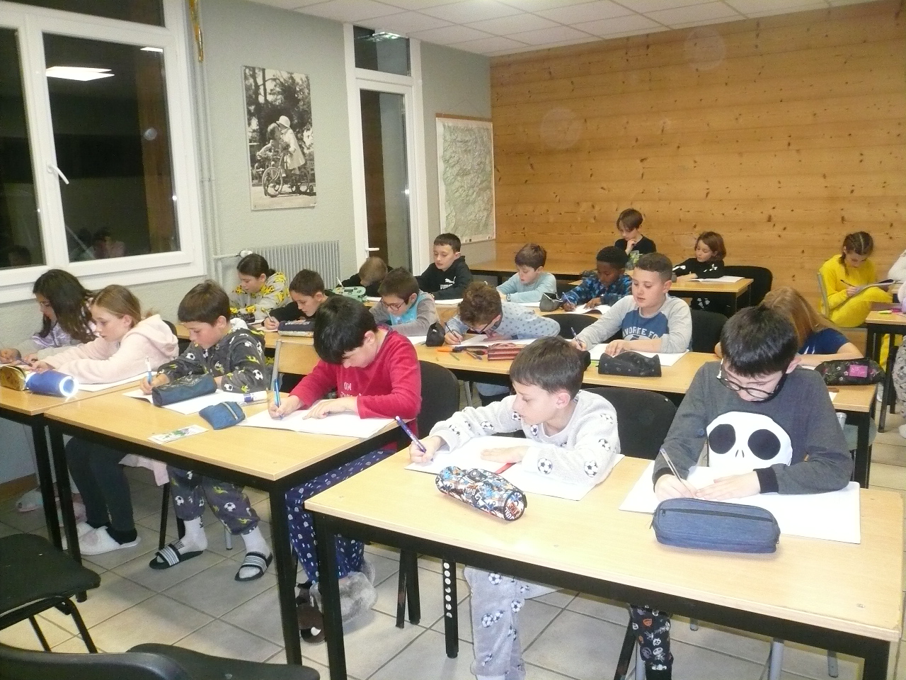 Après le goûter, un petit jeu avec les animateurs, la douche puis une heure de classe. Vous n'allez pas me croire mais ils étaient très contents de retrouver leur beau cahier de classe de neige et leur stylo. En plus, la classe en pyjama c'est pas habituel !