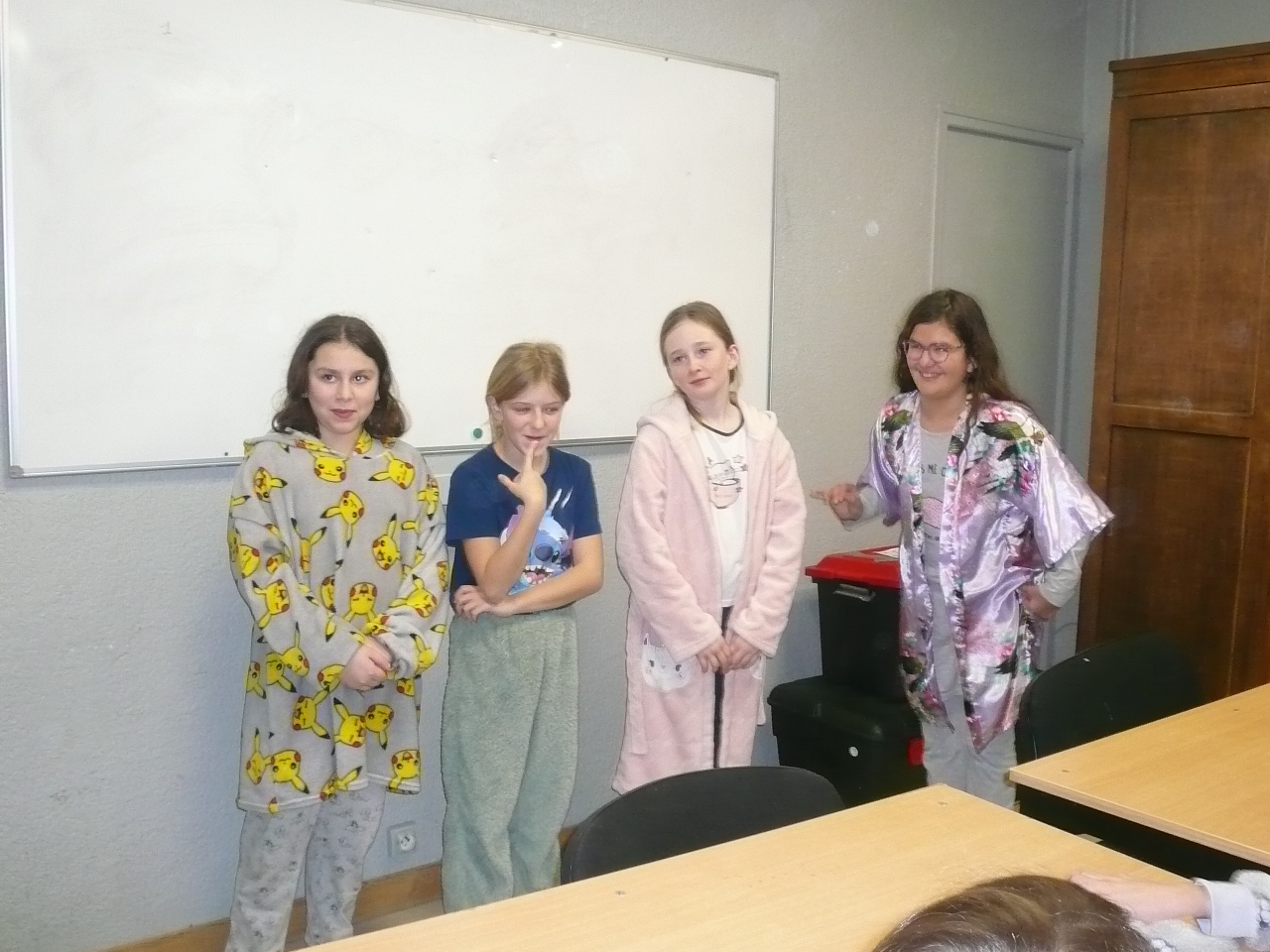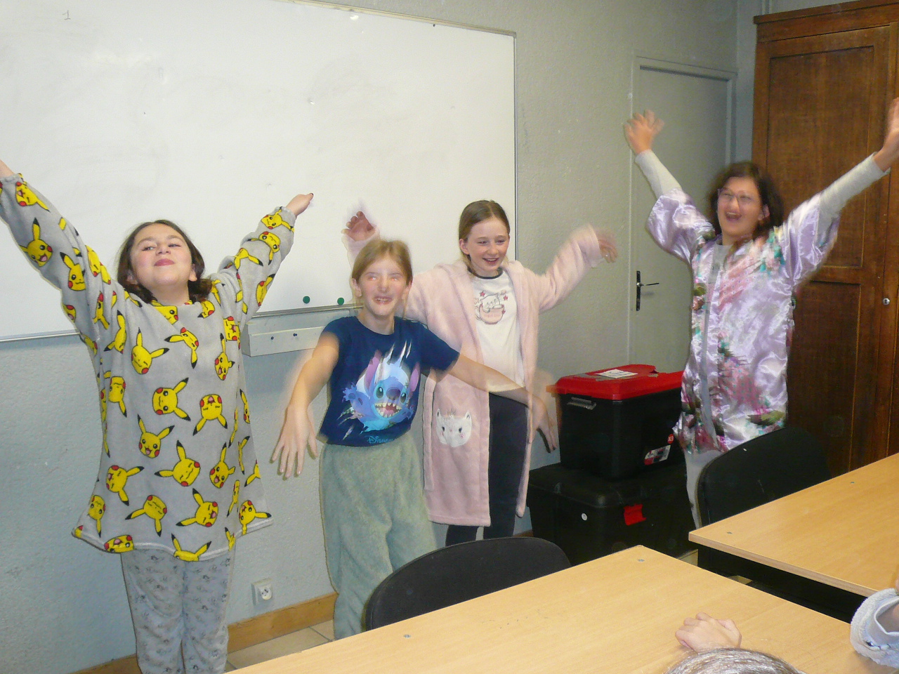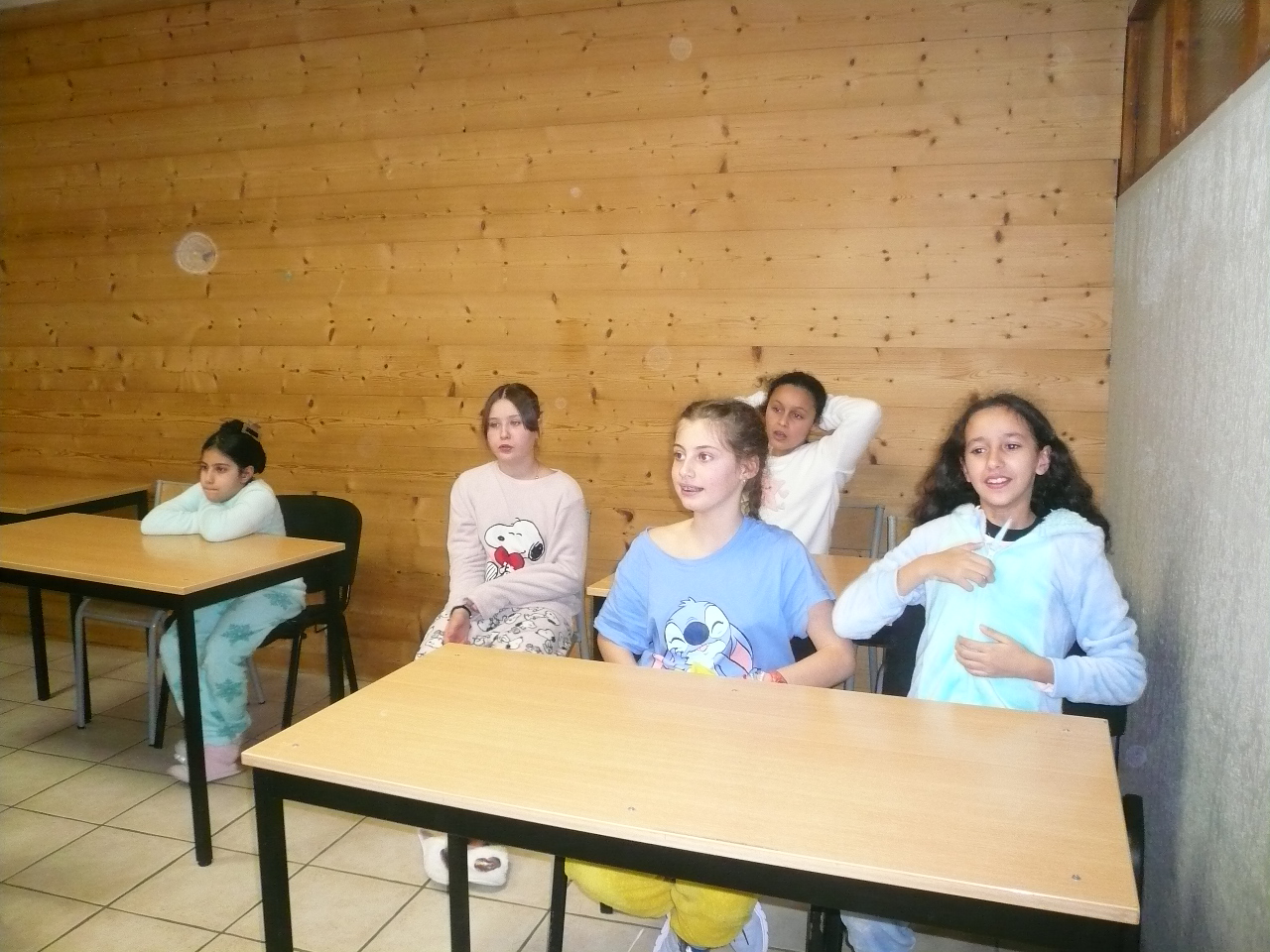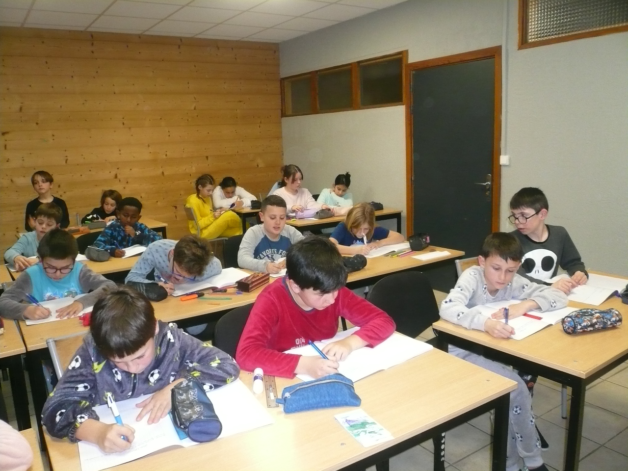 Après le goûter, un petit jeu avec les animateurs, la douche puis une heure de classe. Vous n'allez pas me croire mais ils étaient très contents de retrouver leur beau cahier de classe de neige et leur stylo. En plus, la classe en pyjama c'est pas habituel !