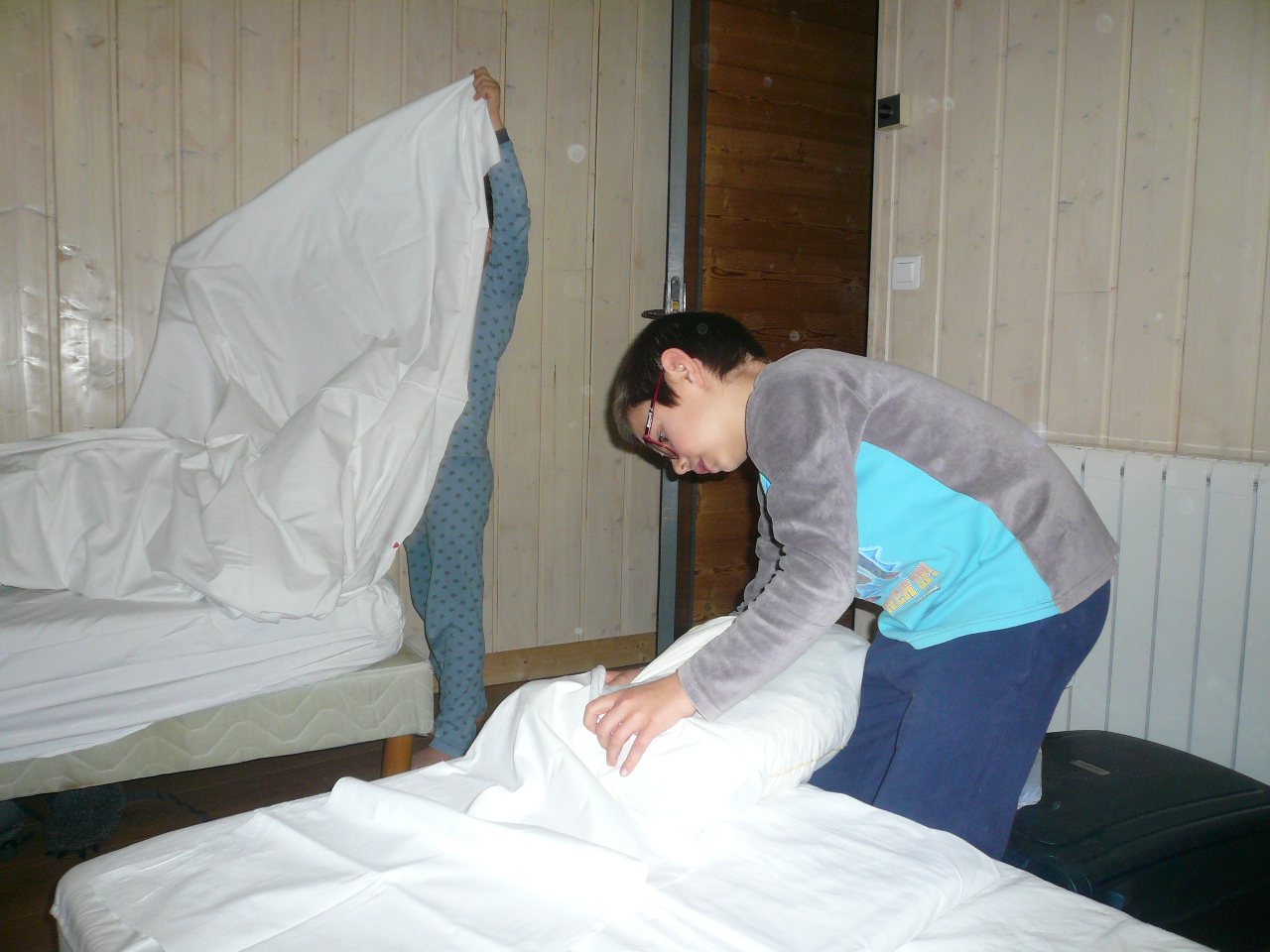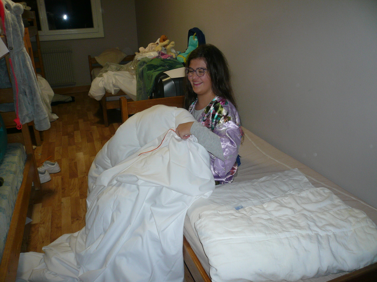 Le moment que je préfère : faire son lit !!! "Pourquoi y'a plusieurs draps dans le sachet ? C'est quoi une taie d'oreiller ? Pourquoi y'a des élastiques au drap housse ? Mais c'est impossible de faire rentrer une couette là-dedans ! Bref, après une lutte acharnée, tous ont réussi !